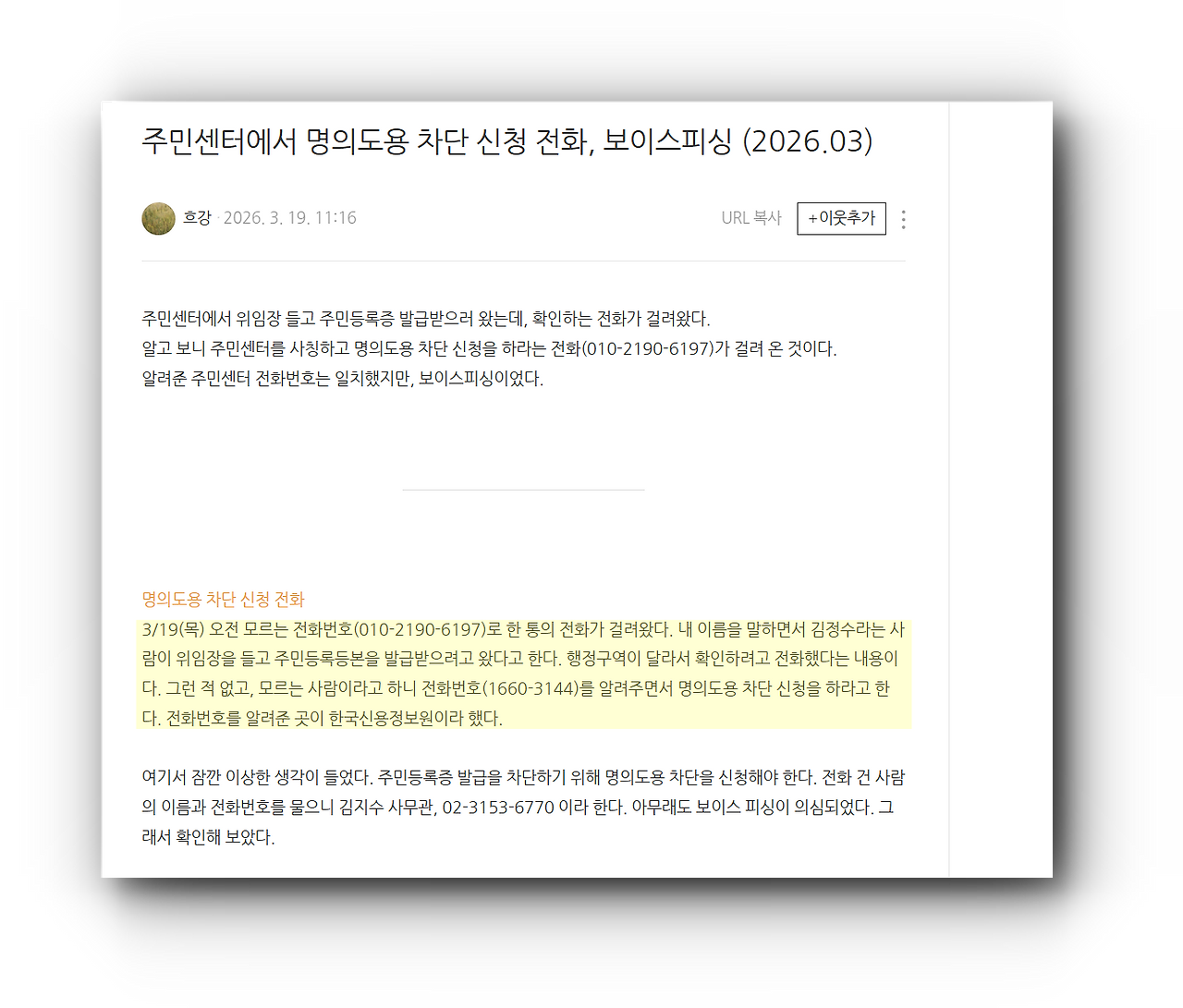 블로그 주인장도 우리와 마찬가지로 합정동 주민센터 사무관이라는 사람으로부터 개인정보 확인전화를 받았다고 한다.