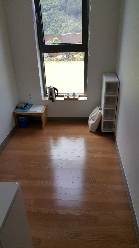 깔끔하고 단정하며, 커다란 창문도 있고 푹신한 침구와 요가매트, 차를 끓여마실 수 있는 전기포트와 다기도 있다.