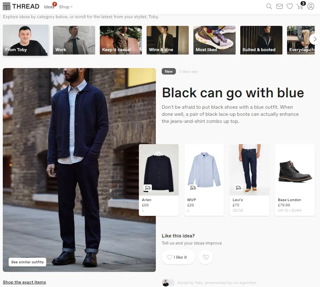 영국의 쓰레드(Thread)도 비슷한 문제의식에서 시작했다. 나만의 스타일리스트를 만난다는 (Meet your stylist) 컨셉으로 시작해, 2018년 글로벌 SPA브랜드 H&M에 투자를 받고 지금은 큐레이션 커머스로 성장해나가고 있다. 국가 설정을 UK로 하면 이용해 볼 수 있는데 아래 사진처럼 마치 잡지에서 바로 쇼핑하는 기분이다. 영국느낌의 댄디한 스타일을 선호한다면 남성분이라면 무료이니 한 번 서비스를 구독해볼만 하다.