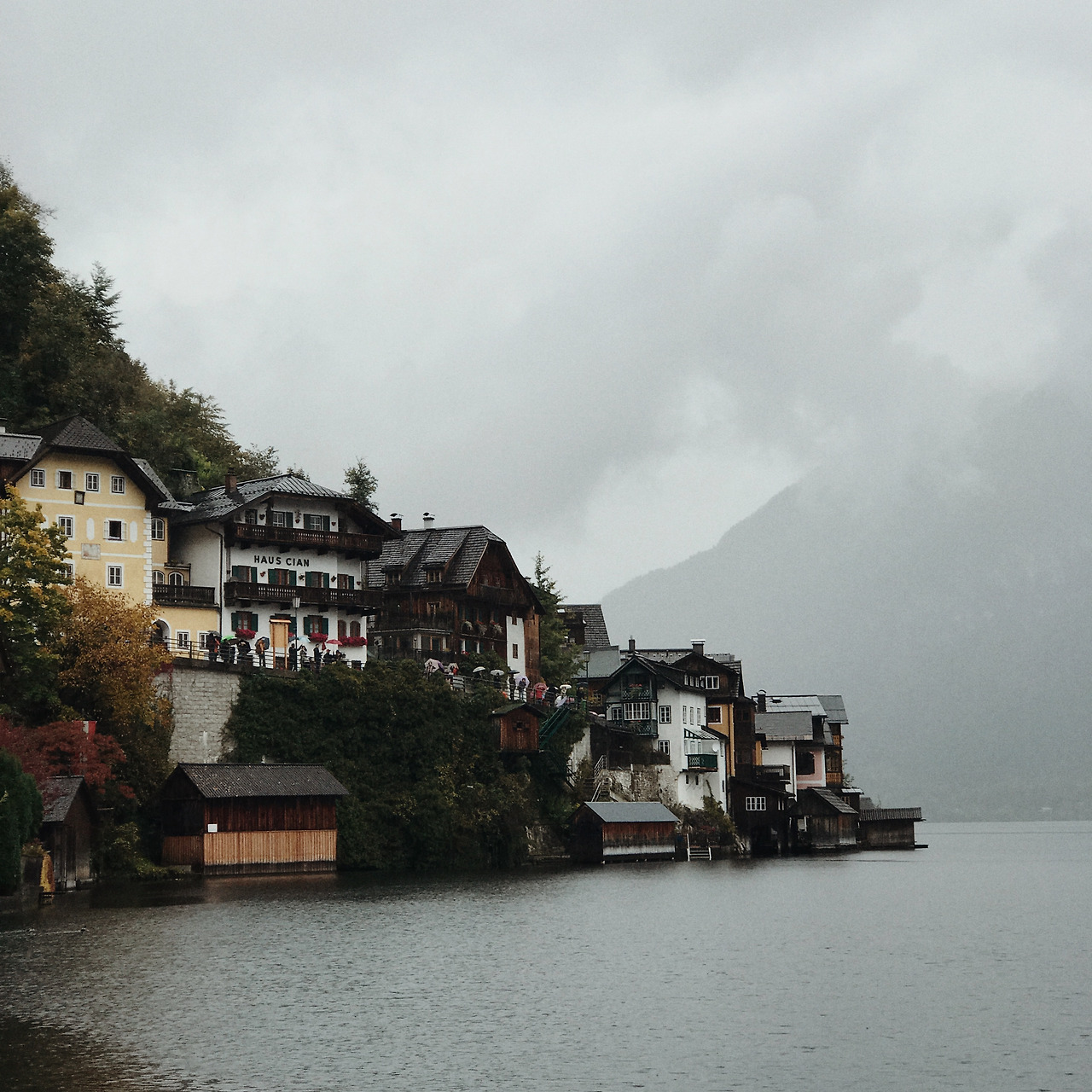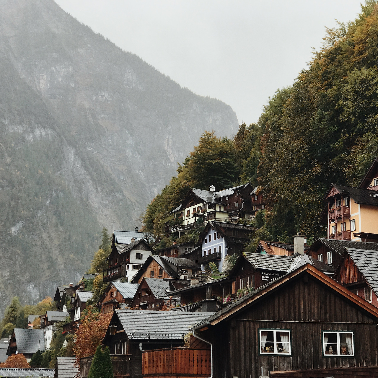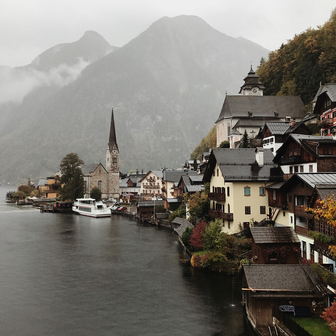 할슈타트 주차장엔 자리가 없을 정도로 관광버스와 자동차가 가득했다. 수많은 관광객 중 하나가 되어 우산을 쓰고 호숫가를 걸었다. 비는 여전히 그치지 않았지만 아기자기한 건물들이 빼곡히 있어서 황량한 느낌을 주진 않았다. 오가는 사람이 많고 길에는 물 웅덩이에 우산은 두 개 밖에 없어서 2인조로 짝을 지어 걸었다. 걷는 것만으로 지쳐서 모든 것이 축축해질 때쯤 노천에 있는 식당에서 배를 채웠다. 한국인들이 얼마나 많이 오는지 사장님의 한국어가 무척이나 유창했다. 대중교통으로 오기가 쉽진 않다고 하더니 옆 테이블엔 동행을 구해 온 듯한 한국인 여행객 무리가 있었고, 어색함이 눈에 보여 부럽기도 하고, 다행스럽기도 했다. 메뉴는 굴라쉬 수프와 슈니첼.