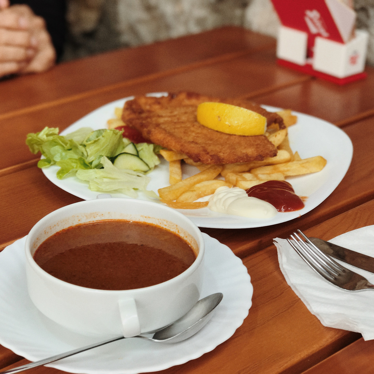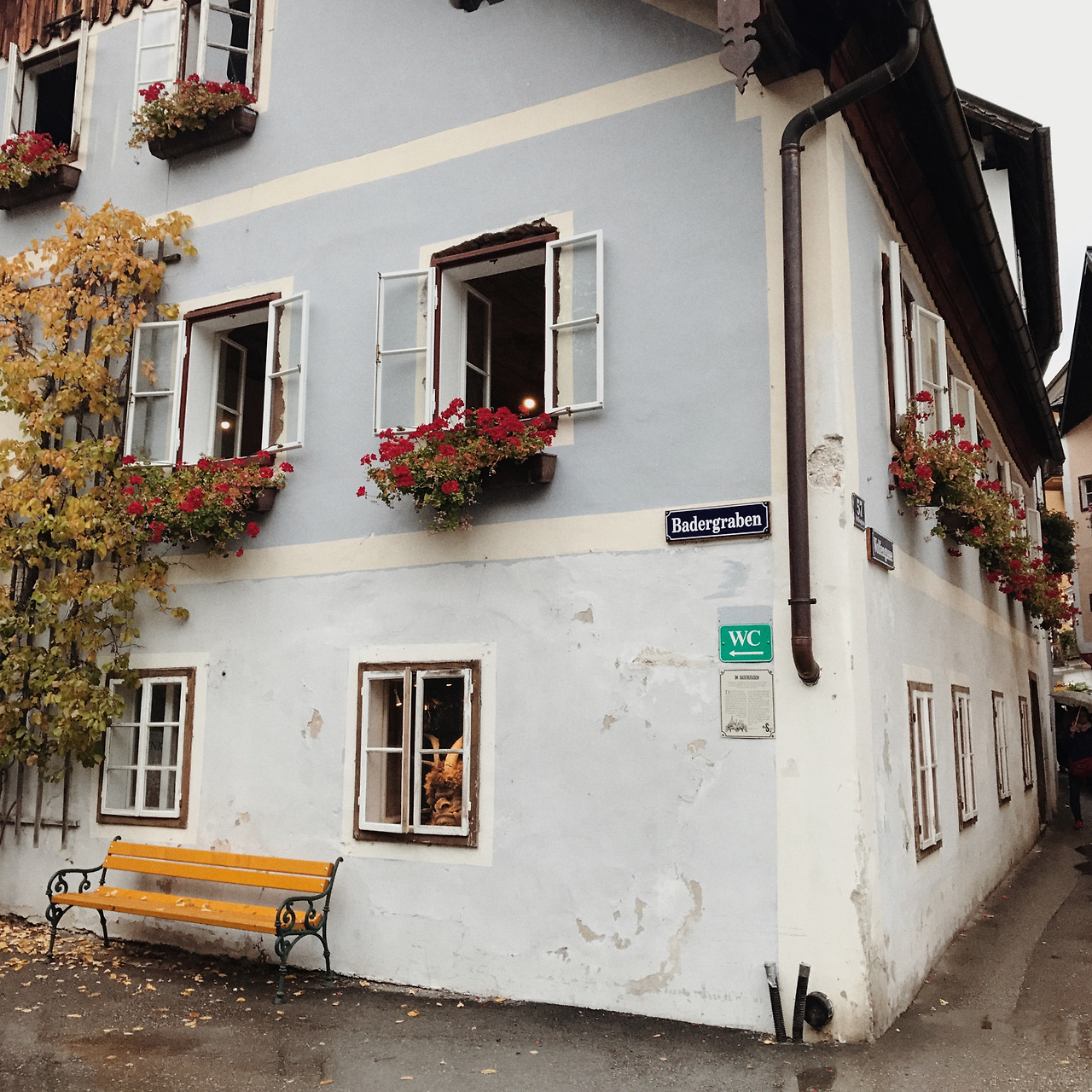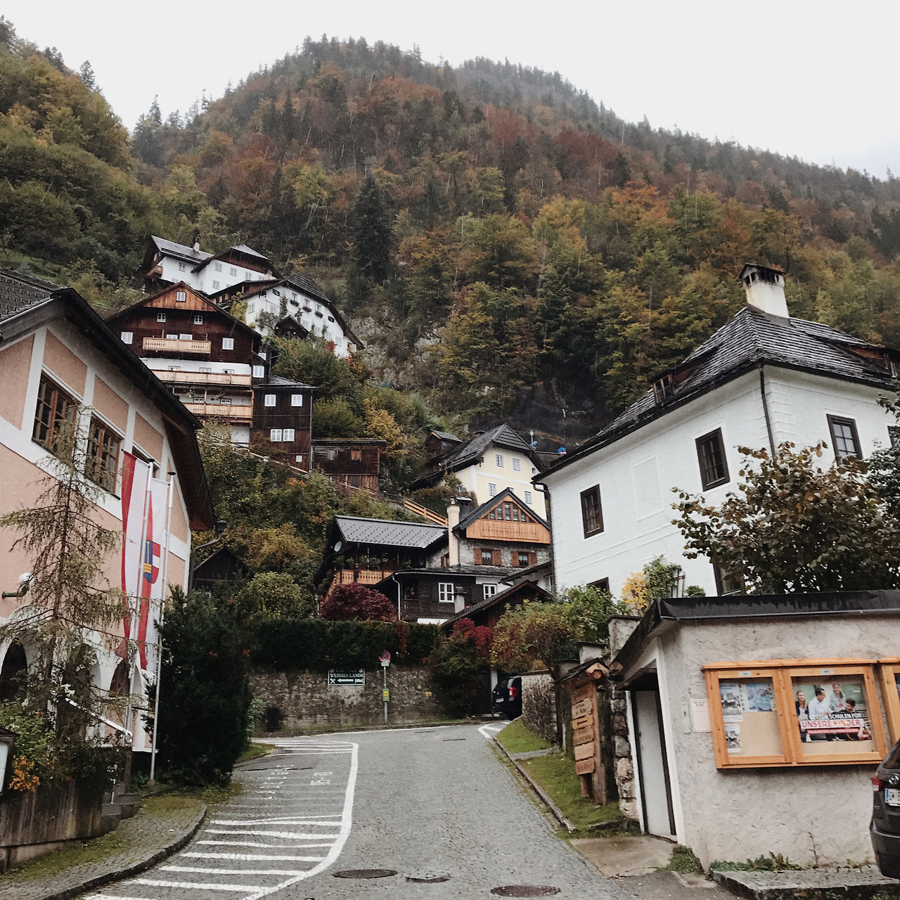 할슈타트 주차장엔 자리가 없을 정도로 관광버스와 자동차가 가득했다. 수많은 관광객 중 하나가 되어 우산을 쓰고 호숫가를 걸었다. 비는 여전히 그치지 않았지만 아기자기한 건물들이 빼곡히 있어서 황량한 느낌을 주진 않았다. 오가는 사람이 많고 길에는 물 웅덩이에 우산은 두 개 밖에 없어서 2인조로 짝을 지어 걸었다. 걷는 것만으로 지쳐서 모든 것이 축축해질 때쯤 노천에 있는 식당에서 배를 채웠다. 한국인들이 얼마나 많이 오는지 사장님의 한국어가 무척이나 유창했다. 대중교통으로 오기가 쉽진 않다고 하더니 옆 테이블엔 동행을 구해 온 듯한 한국인 여행객 무리가 있었고, 어색함이 눈에 보여 부럽기도 하고, 다행스럽기도 했다. 메뉴는 굴라쉬 수프와 슈니첼.