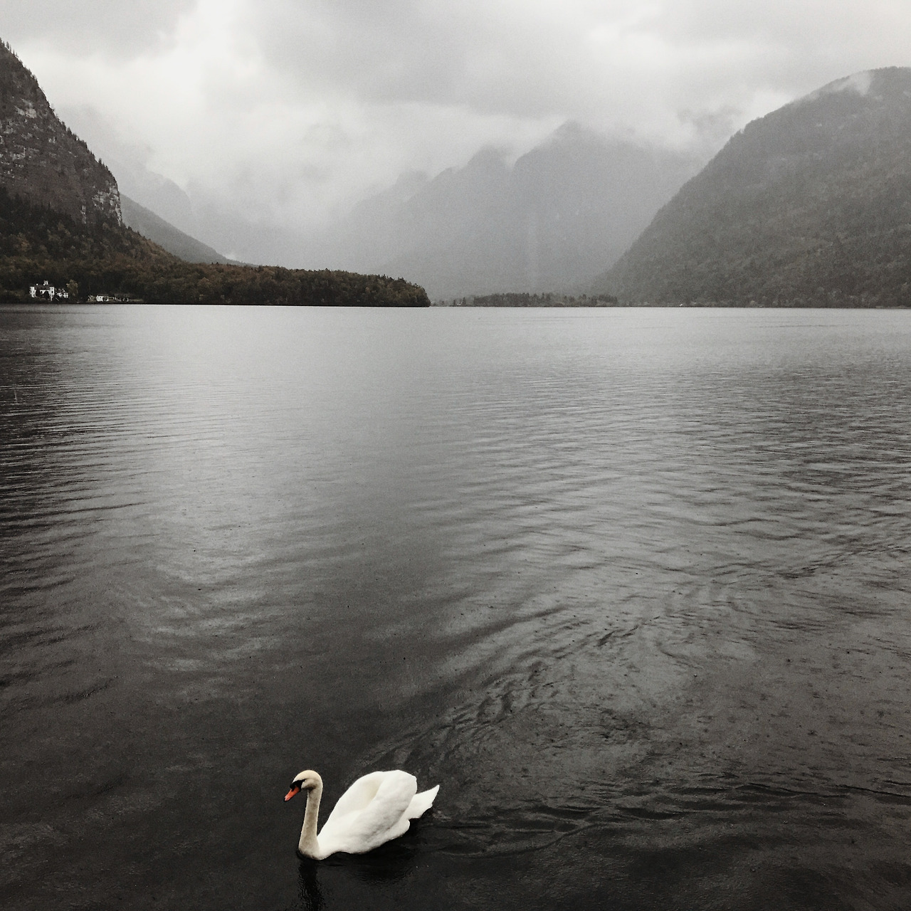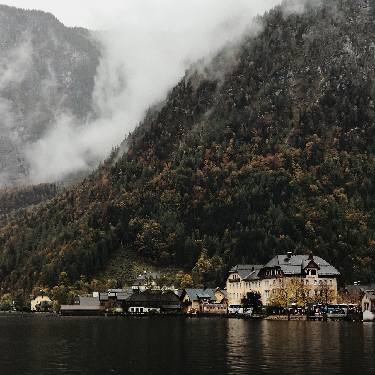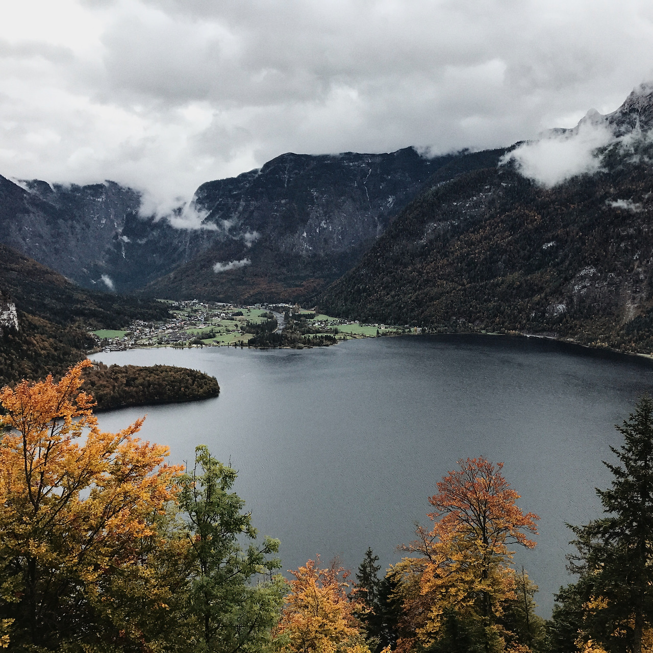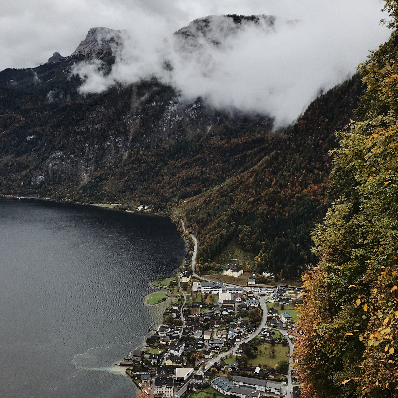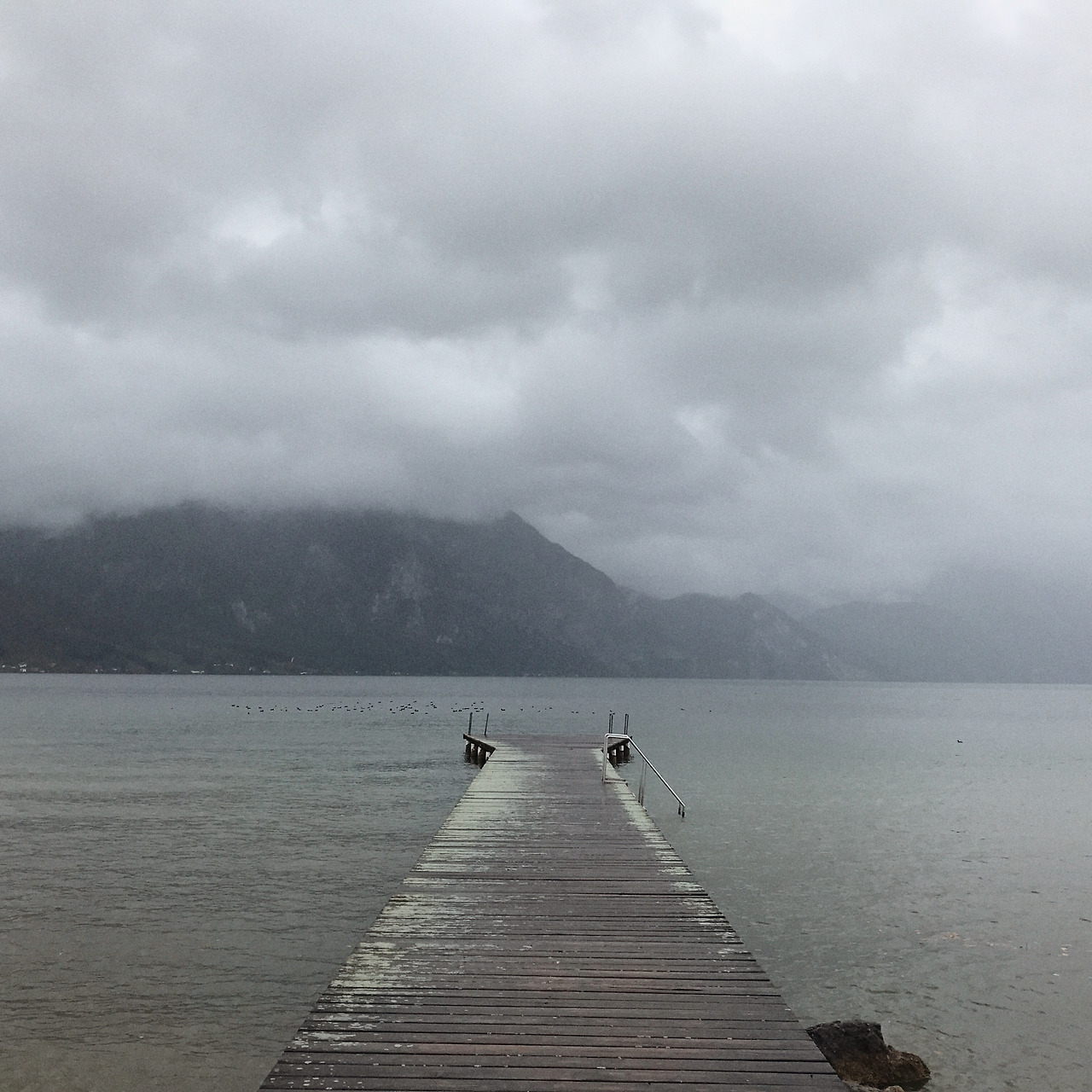 할슈타트까지는 세 시간 반 정도 걸려서 휴게소에도 들르며 중간중간 쉬어갔다. 고속도를 벗어나 높은 산 들이 보이기 시작할 무렵, 첫 번째 호수인 트라운호 (Traunsee)를 마주쳤다. 관광지로서 이미 너무 알려진 할슈타트 대신 조금 더 조용한 곳이 없을까 해서 찾아봤던 곳 들 중 하나였다. 하지만 '호수 뒤로 펼쳐지는 광활한 산맥'이나 '초록색 들판과 파란 하늘과 물빛'은 날씨 앞에서는 모두 잿빛이고 황량했다. 여기가 알프스인지 일산 호수공원인지 모를 일이었다.