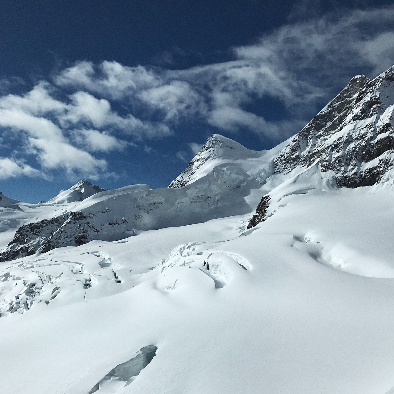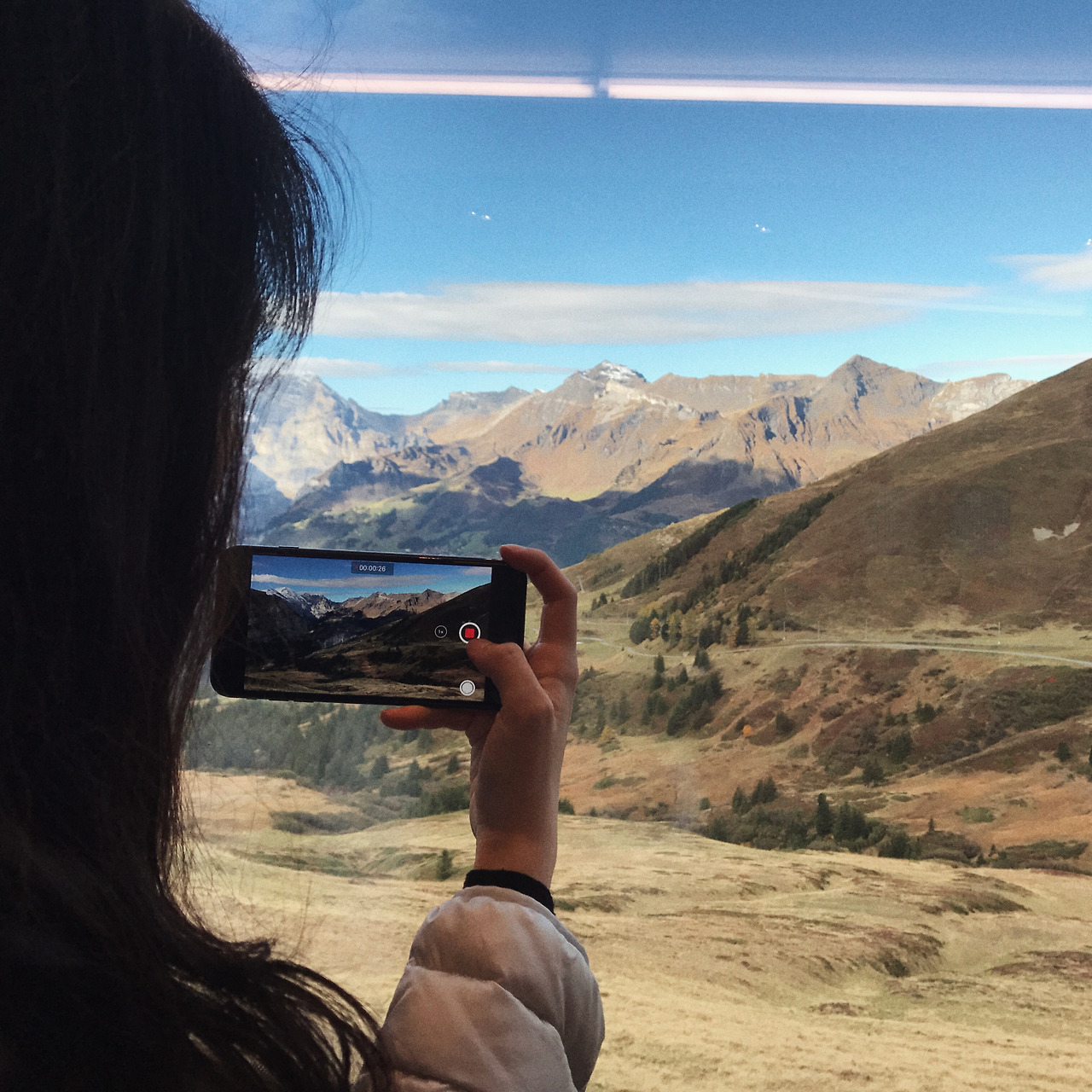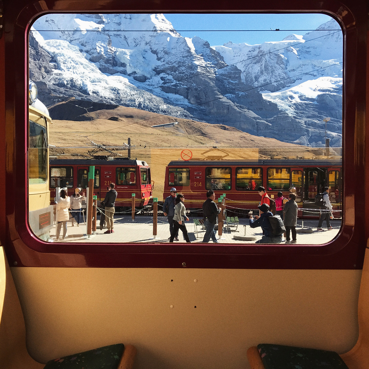 인터라켄에서 융프라우요흐까지 올라가는 산악열차는 약 50분 정도 시간이 소요되는 아주 천천히 가는 기차다. 전문 가이드와 함께였다면 이 열차가 몇 년도에 생겼고부터 시작해서 온갖 질문을 받아줬을 텐데 딸내미 가이드는 아는 게 없어 머쓱했다. 그저 함께 감탄만 할 뿐. 창 밖 풍경은 연두색이었다가, 황토색이었다가, 흰 눈이 등장할 무렵 내려서 열차를 한 번 갈아탔다. 차가워진 공기가 신기했다.