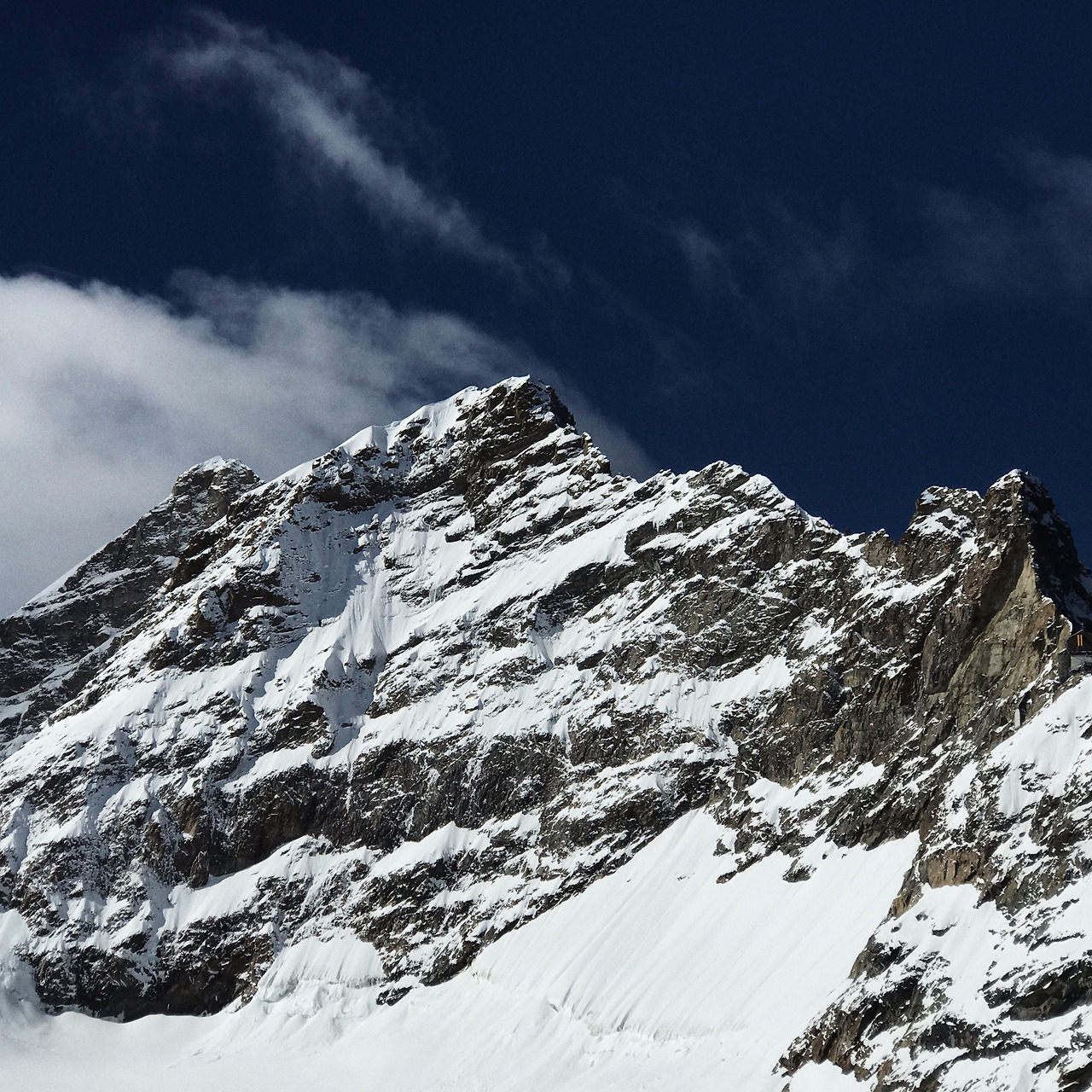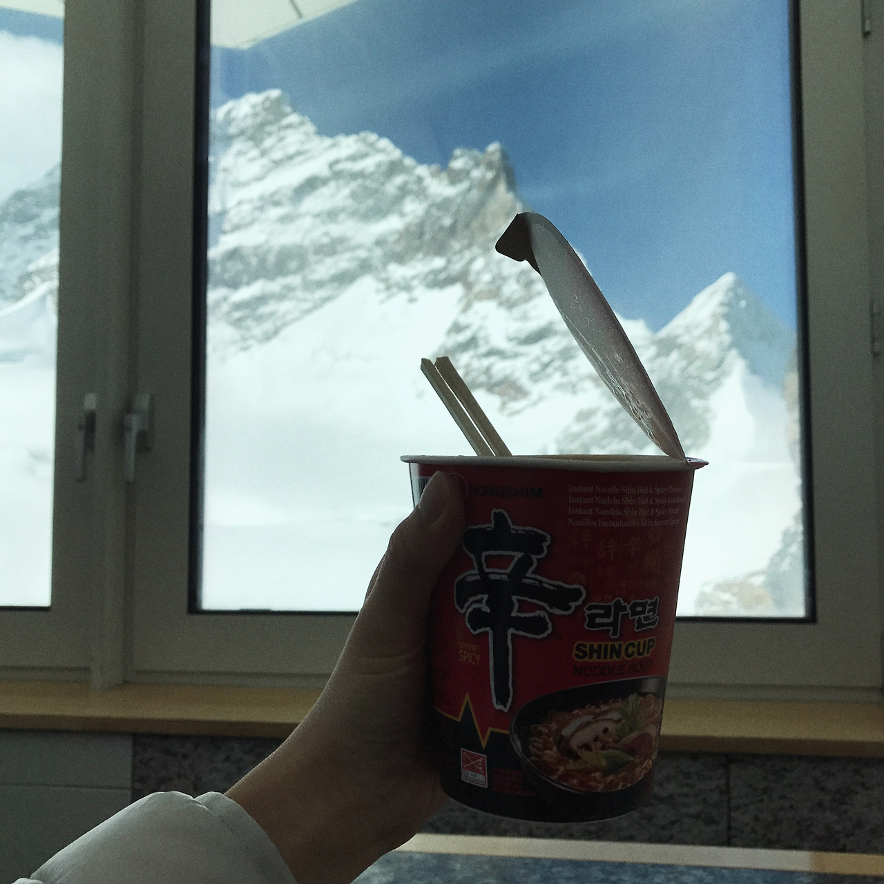 설산을 앞에 두고도 추워봤자 얼마나 춥겠어? 하던 건방진 생각은 밖으로 나가자마자 몰아치는 차가운 바람에 사라졌다. 사방으로 날리는 머리카락과 미끄러운 바닥. 그러니까 우아함을 유지할 수 있는 상황이 아니었던 것이다. 구름 한 점 없이 맑은 날씨에 융프라우요흐가 아주 선명하게 보였고, 조상신께 감사드리는 마음이 갑자기 생겼다. 다양한 위치에서 다양한 포즈로 빠르게 인증샷을 남기고 다시 내부로 들어와 열차 티켓을 사면서 받은 신라면 쿠폰으로 몸을 녹였다. 백인 점원들이 쉴 새 없이 컵라면에 물을 붓는 장면은 융프라우요흐 관광국과 신라면의 관계가 무엇인지 궁금해지는 광경이었다.