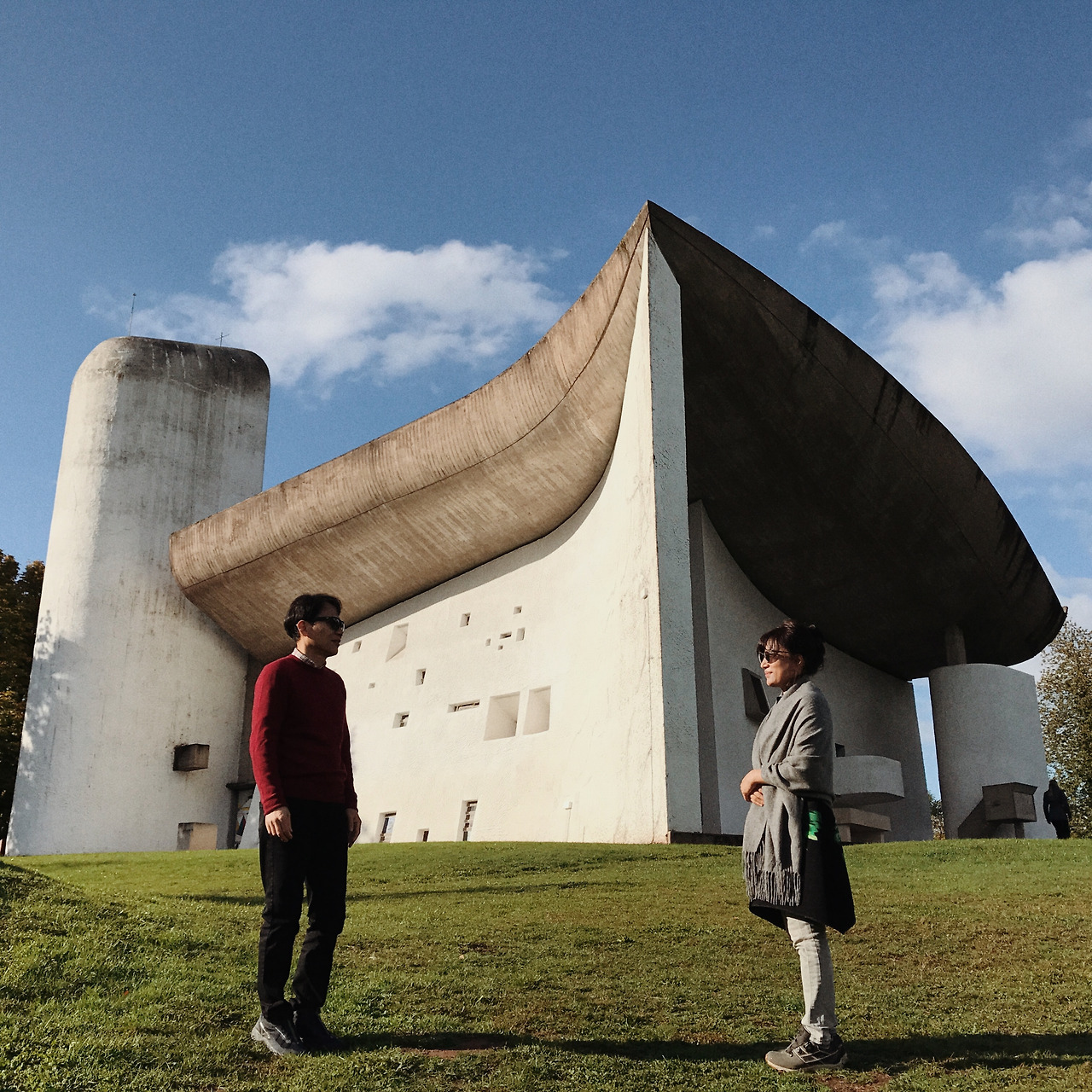 오늘의 운전대는 아빠가 잡았다. 강원도에서 운전병으로 군 생활을 한 아빠의 운전 실력은 특히 꼬불꼬불한 산길에서 십분 발휘된다. 푸른 잔디 위에서 소들이 한가롭게 풀을 뜯고 그 뒤로는 엄청난 설산이 보이는, 말 그대로 그림 같은 풍경들이 이어졌다. 지금 이 풍경을 지루해하지 않으려 눈에 꾹꾹 눌러 담으며 애를 썼다. 오늘의 목적지는 르 코르뷔지에가 건축한 프랑스의 롱샹성당(노트르담 뒤 오)으로 출발지 아델보덴에서 세 시간 정도 거리였다. 짧은 일정에 프랑스까지 가는 게 무리였지만 엄마의 오래된 위시리스트였다. 부모님께는 여행의 선택지가 여행사를 통한 패키지여행밖에 없기에 조금 고생스러워도 자유여행에서만큼은 원하는 바를 되도록 맞춰 드리려 하는 편이다.