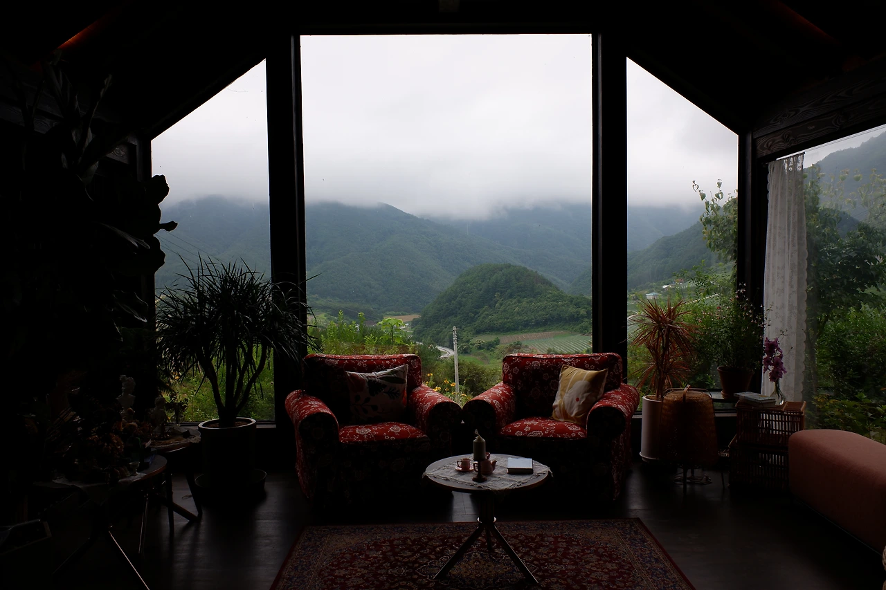 비나리마을에 위치한 숙소 홀리가든은 방이 두 개뿐이라 일단 조용해서 좋았다. 그리고 침실에서 보이는 산과 밭 뷰는 사진에서 보던 것보다 훨씬 훨씬!!! 좋았다. sns용 사진 찍기 좋은 곳이 아닌가 싶어서 큰 기대는 하지 않았는데 정말 아름다운 경치였다. 고지대에서 느껴지는 상쾌한 공기랑 초록 초록함의 조합은 환상의 짝꿍.. 테라스 의자에 앉아 한참을 쳐다봤다. 저녁은 바비큐 대신 봉화읍 하나로마트에서 산 라볶이에 컵밥으로 간단히 먹었다. 이른 아침 퉁퉁 부은 얼굴로 맡은 새벽 공기가 너무 촉촉해서 아, 이 맛에 귀농을 하는가 싶을 정도였다. 조식을 먹는 카페 공간도 프라이빗해서 좋았다. 갓구운 식빵에 사과즙을 곁들였다. 매트리스가 나와 맞지 않아서 잠을 꽤 설쳤음에도 예약을 할 수만 있다면 또 가서 묵고 싶은 곳이었다.