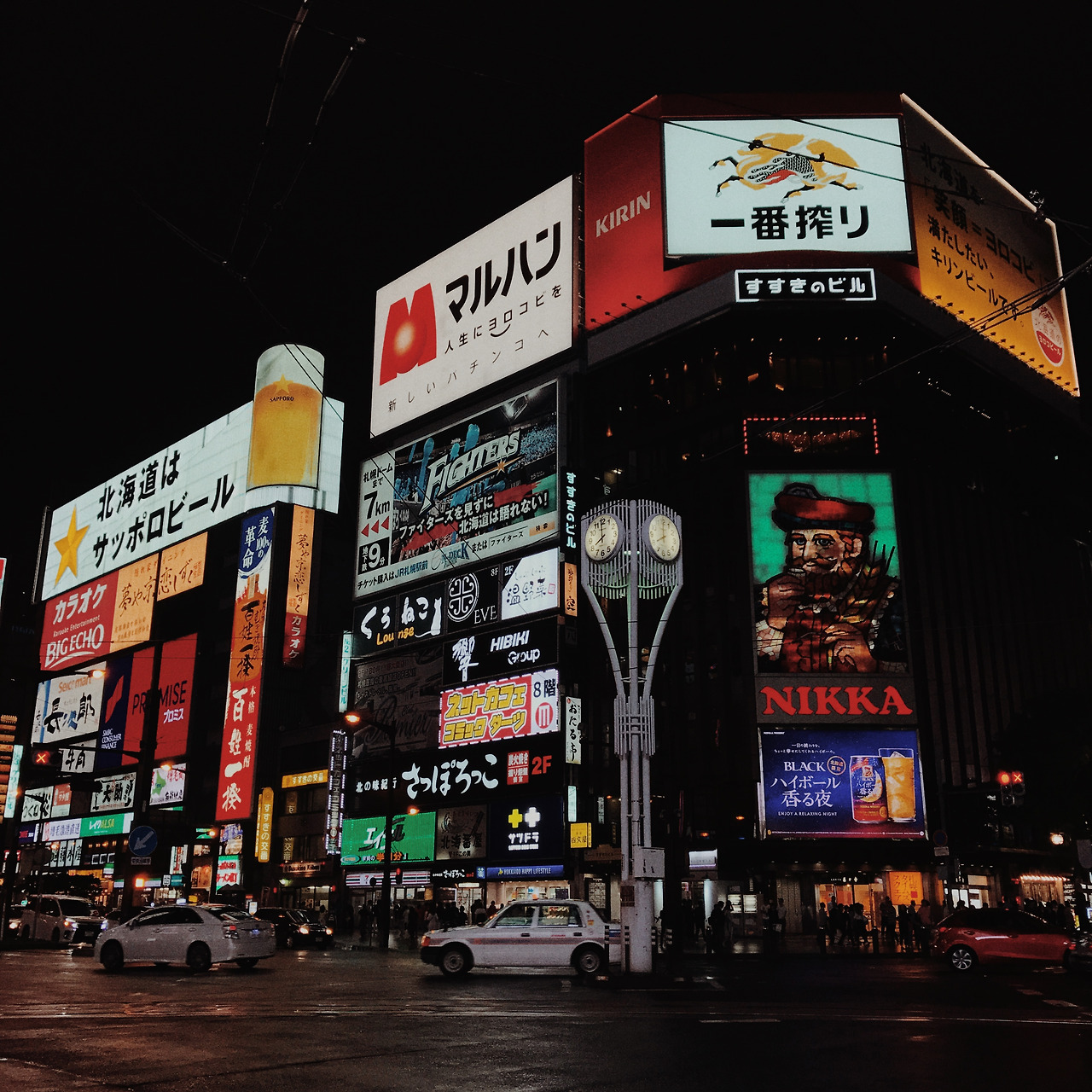 내일 출국을 위한 짐 정리를 하고, 체력을 회복한 상태로, 마지막 밤의 아쉬움을 달래러 나갔다. 오도리 공원을 기준으로 호텔은 북쪽, 식당이 많은 번화가는 남쪽이다. 마지막 날이 되어서야 삿포로 시에서 가장 번화한 '스스키노' 쪽으로 걸어갔다. 삿포로 시에는 전차가 다녀서 지금까지 봤던 일본의 도시들과 다른 느낌을 주었다. 오사카에 글리코상이 있다면 삿포로에는 니카짱이 있다. 수줍게 술잔을 들고 있는 니카짱의 뒷 배경이 은은하게 계속 바뀌었다. 거대한 간판들이 뿜어내는 빛이 대단했다.