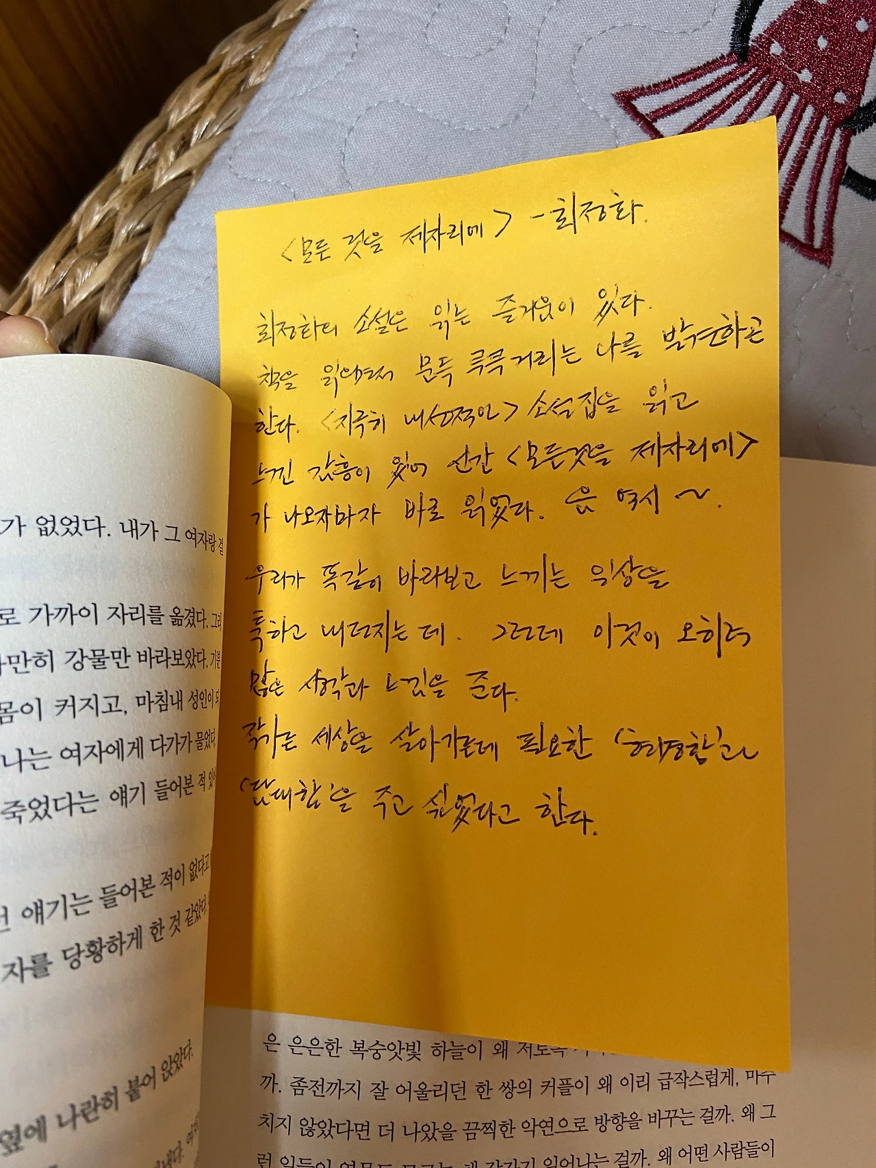 엄마한텐 내가 언제 그만 둬도 놀라지 마시오! 라고 한마디 예방주사를 놓아두었지만(우리 엄마, 뭘 해도 밥 굶겠냐? 알아서 하라고 답해주셨다. 옛날엔 그게 진심이 아닐 거라고 생각했는데, 이젠 그게 진심인 걸 알아서 더 고마운 마음^^) 그치만 나는 청개구리 기질이 있어서(하지마, 하면 더 하고 싶고, 니 맘대로 해, 하면 상대 의견을 따라주고 싶어 ㅋㅋㅋㅋ 그만둬도 된다고 하니, 쫌 더 신중하게 현실적으로 생각하자!는 마음이 들었다.) 그래서 당분간은 더 다니기로 하고, 출력했던 종이는 구겨서 책 사이에 집어넣었다.(지금은 그 종이가 어디로 갔는지도 모르겠다^^;;)