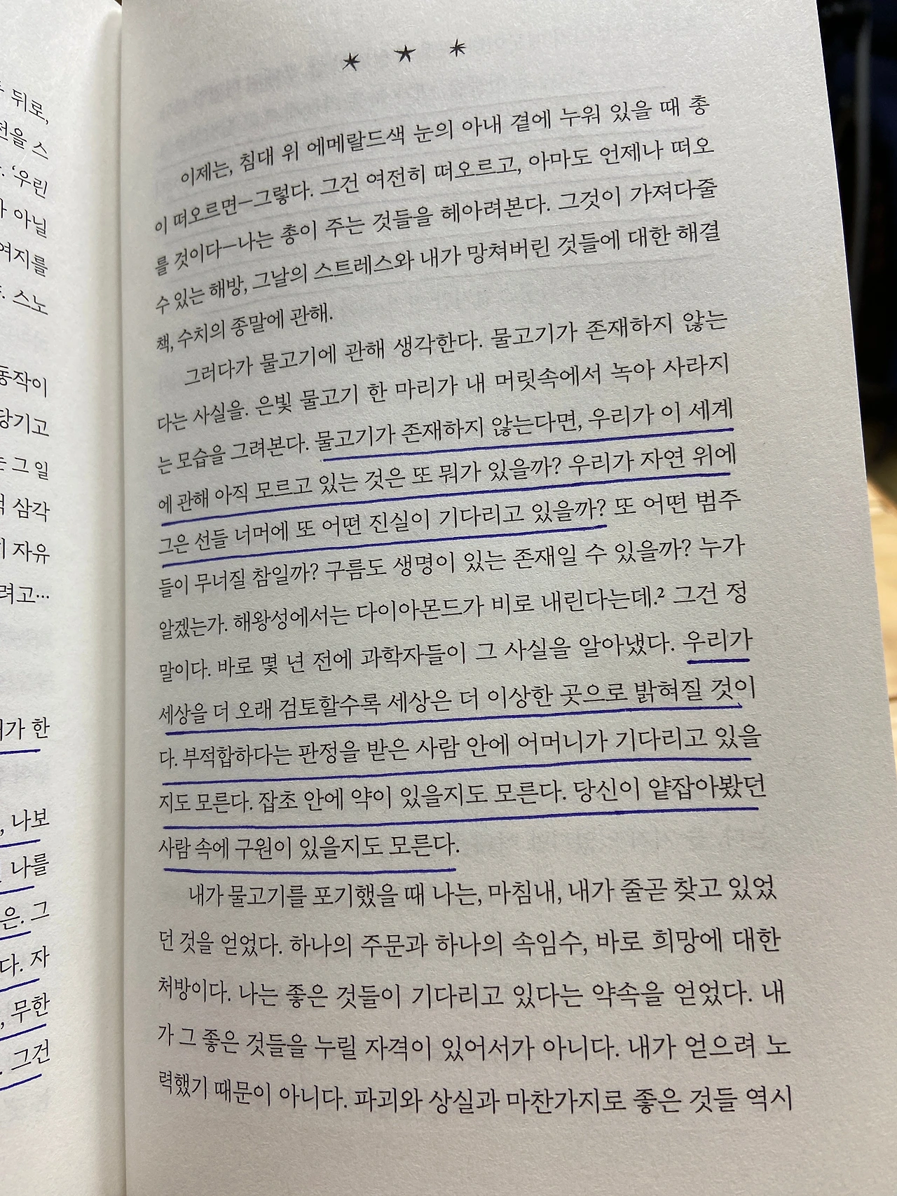 그 좋은 것들, 그 선물들, 내가 눈을 가늘게 뜨고 황량함을 노려보게 해주고, 그것을 더 명료해 보게 해준 요령을 절대 놓치지 않을 가장 좋은 방법은 자신이 보고 있는 것이 무엇인지 전혀 모른다는 사실을, 매 순간, 인정하는 것이다. 산사태처럼 닥쳐오는 혼돈 속애서 모든 대상을 호기심과 의심으로 검토하는 것이다. ㅡ 264쪽