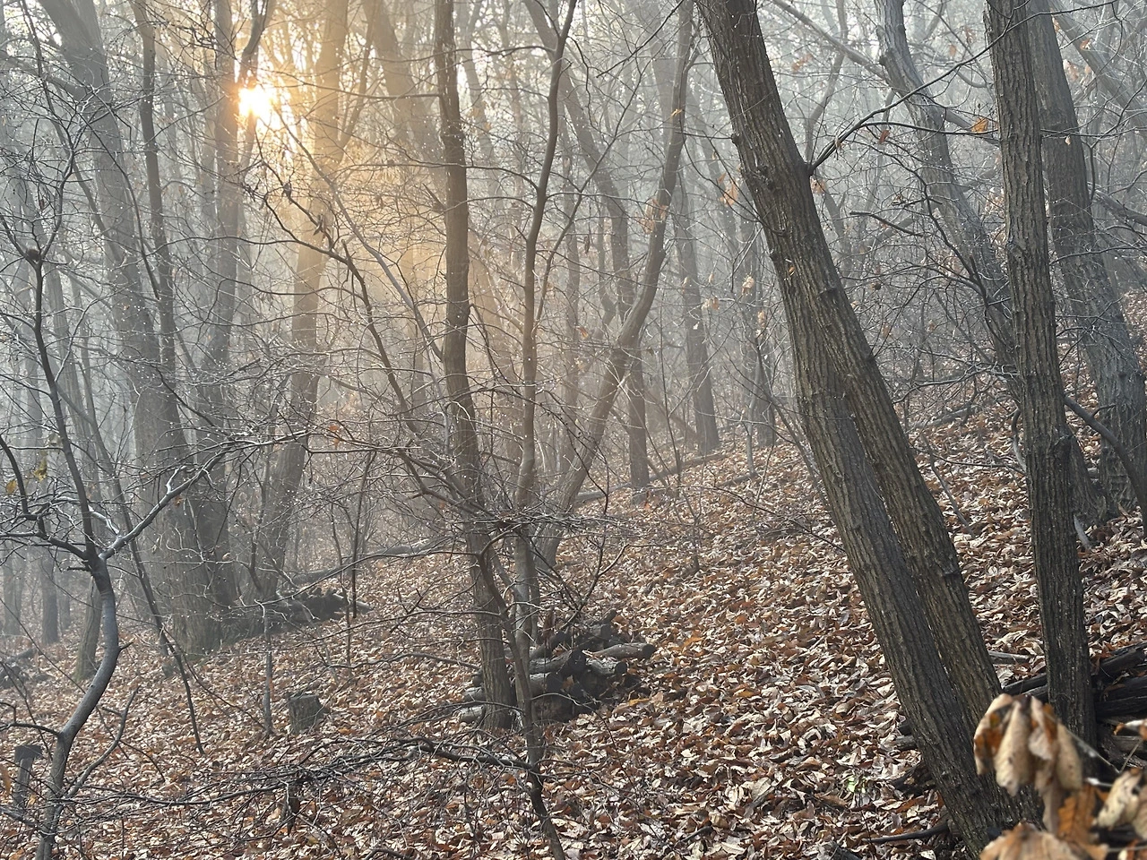 흐린 날 아침, 그래도 산책을 나가니 겹겹의 안개 위로 비치는 햇살이 참 아름답고, 주변에 색이 번져 감탄을 자아낸다. 매일매일 같아 보이지만 같은 날은 없고 비슷해 보이지만 그날의 기쁨들이 있다. 산책하던 강아지도 물끄러니 이 풍경을 바라본다.