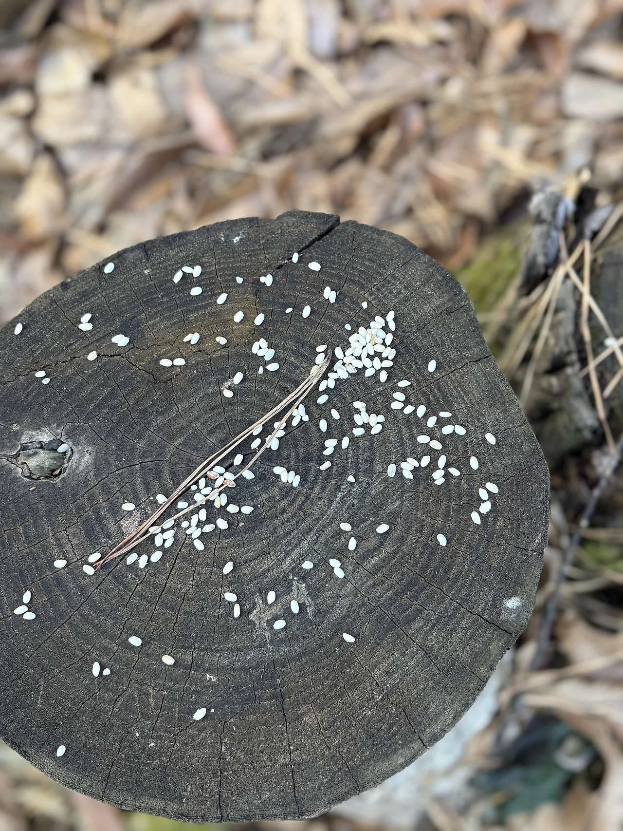 늘 걷는 산책로의 그루터기에 조그맣고 하얀 알갱이가 뿌려져 있다. 눈이 많이 온 후라 '제설제인 염화칼슘인가? 굳이 그루터기에 뿌릴 이유가 있을까?'