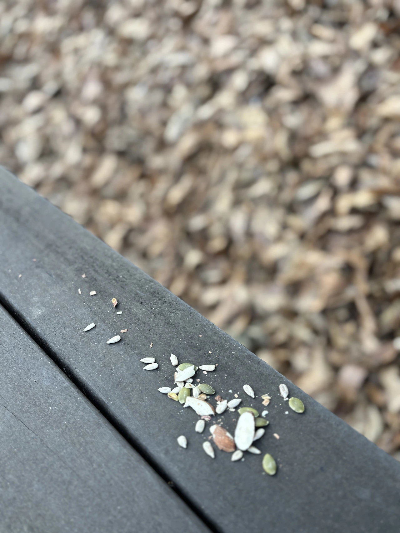 며칠 뒤, 여전히 그 작은 알갱이들은 남아 있었고, 그 주변에 또 다른 것들이 있다. 가까이에서 보니, 해바라기씨, 호박씨, 아몬드 등 견과류다. 나무그루터기의 알갱이도 다시 보니 쌀알이다.
