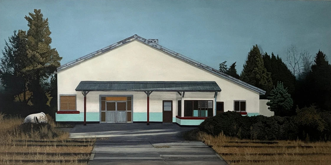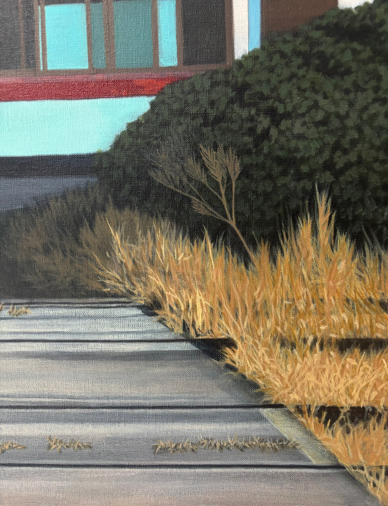 김희연 작가의 작품 <기다리다>로 아크릴로 그렸다. ‘아크릴로도 이렇게 멋지게 그릴 수 있구나. ’큰 그림 앞에 서니 그림이 내 마음속으로 걸어들 오는 것 같았다. 아니 내가 걸어 들어가고 있는 것 같았다. 오래전 기억 속에 숨은 듯한 작은 기차역이었다. 어떤 기차역인지 이름도 없고, 철로 위의 나무길에는 풀들이 삐죽 올라있다. 뭔가 아주 오래된 기차역이다. 철로에는 풀들이 무성하다. 기차가 다니지 않는 기차역인가.