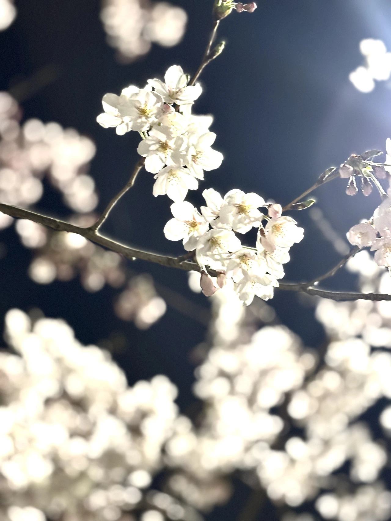 밤에는 검푸른 하늘과 조명에 빛나는 벚꽃이 대비되어 아름답다.