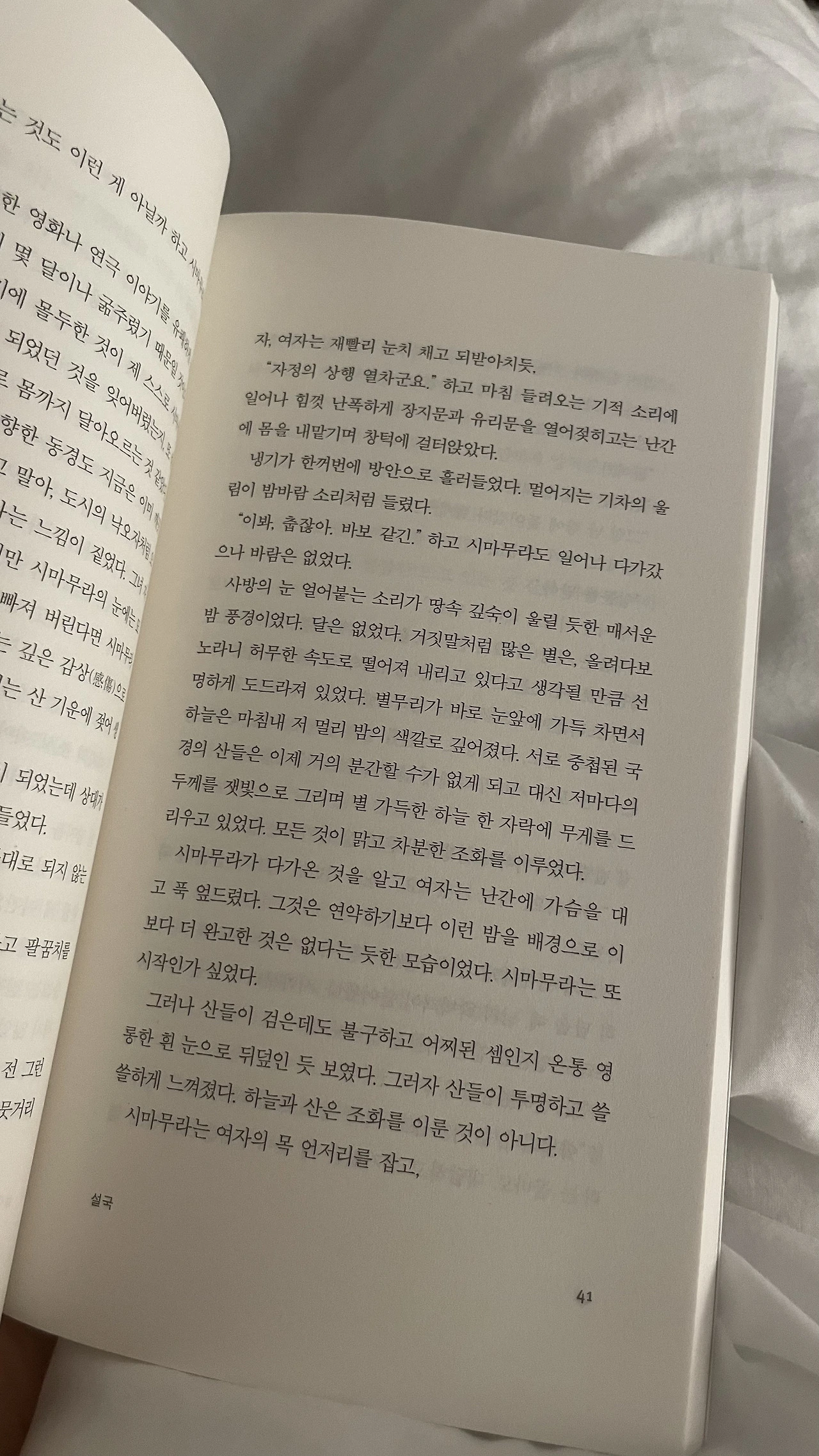 너무나도 눈 내린 일본에 가고 싶은 마음이 간절해졌다. 소설 속에서의 ‘설국’은 그 도시에 대한 사랑과 그 도시에 사는 여자에 대한 애정이 가득 느껴지기 때문일 것이다.