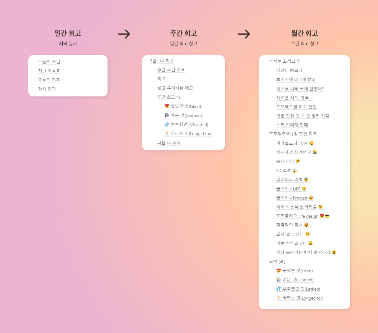 전문성을 쌓기 위하여 다양한 서비스와 아티클에 관심을 기울이려 했다. 지금 당장 도움은 되지 않을 수 있지만 나중에 인사이트로 떠오를 수도 있기 때문에. 기록은 다양하게 하고 있었는데 실질적으로 업무에 활용을 많이 하고 있지는 못한 것 같다. 이것저것 주제가 많아지니 찾아보는 것도 불편하다. 조금 더 활용도 높은 기록 방식을 찾아보면 좋을 것 같다.