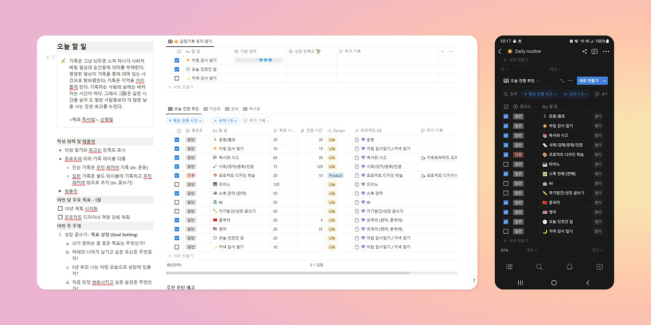 방향성을 대강 정리하고 단기적으로는 어떻게 시간을 보내면 좋을지 루틴 계획을 세우고 진행했다. 당연히 이것도 기록이 중요하기 때문에 노션을 활용해서 평일, 주말에 진행해야 할 루틴을 리스트업하고 시각적으로 확실히 해야 할 것들을 인지할 수 있도록 구성했다. (주로 PC로 기록하지만 바쁘면 출퇴근 시간에 지하철에서 스마트폰으로 진행 중)