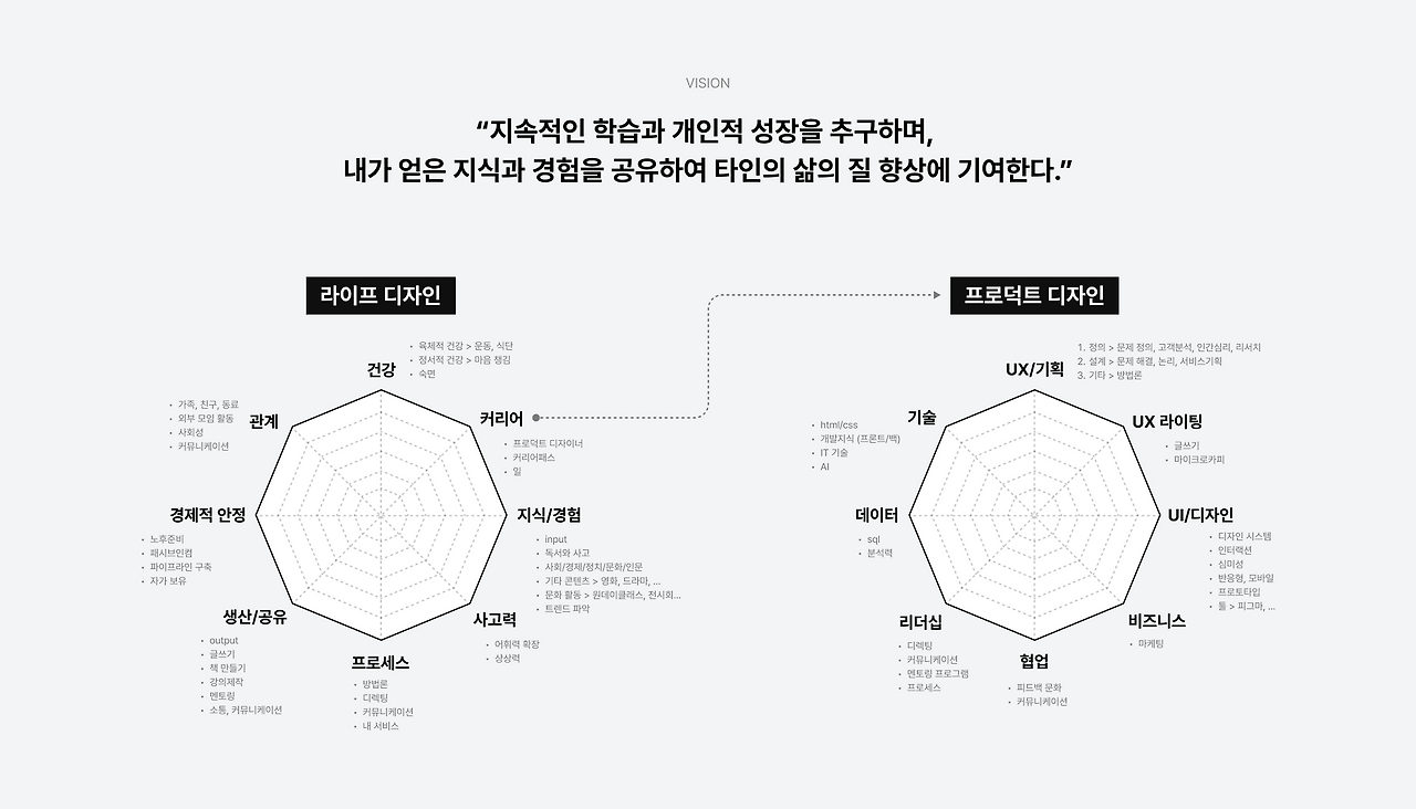한 달 전 1월 회고를 하면서 목표가 불분명했다는 피드백이 많이 나왔다. 방향성을 더 명확하게 설정할 필요성이 느껴져서 내 삶의 두 주축인 라이프 디자인과 프로덕트 디자인에 대하여 비전 보드를 만들어보았다. 6각형으로 만들려고 했지만 욕심이 과했는지 적다 보니 8각형이 되어버렸다.