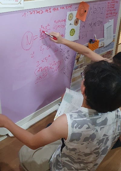 한참 혼자 문제를 풀던 둘째가 부르자 첫째가 방에서 나왔다. 보드에 풀어놓은 것을 보더니 고개를 끄덕였다.