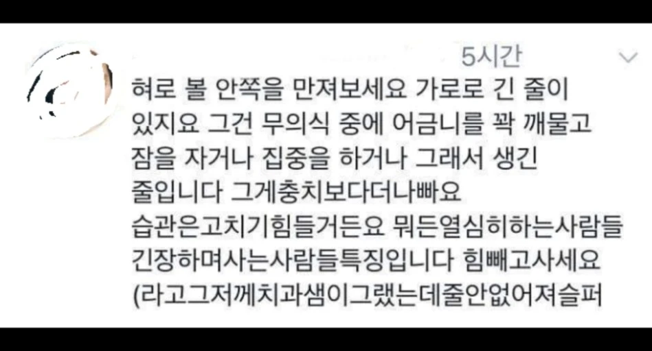 의식적으로 종종 볼 안쪽을 혀로 쓸어보는 건 저 짤을 보고 난 후부터다. 여느 때와 같이 인터넷의 파도에 몸을 둥둥 맡긴 채 이런저런 소식을 훑어보던 어느 날, 벼락같이 마주했던 짤.