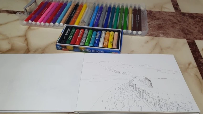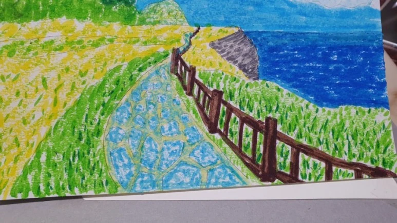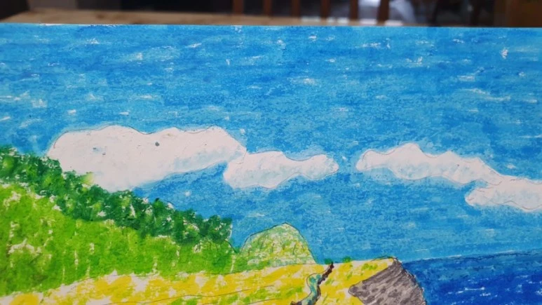 아직 익숙지 않은 문교 10색 오일파스텔을 이용하여 바탕색을 넣어주었어요.