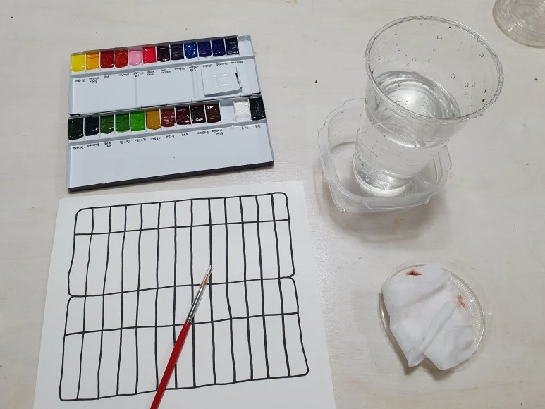 물감의 수대로 칸을 그어준 뒤에 물감의 색을 써주고 나서, 수채화 물감에 물을 적게 묻혀서 종이에 진하게 칠해준 뒤 물을 조금씩 더하면서 아래로 내려갑니다. 눈으로 보이는 물감의 색과 물을 만나서 발색이 되는 것이 확연히 차이가 나기에 물감 발색 차트는 꼭 만들어야 제대로 된 수채화를 즐길 수 있습니다.