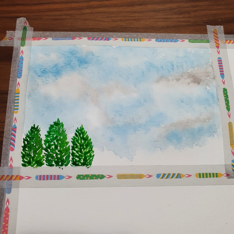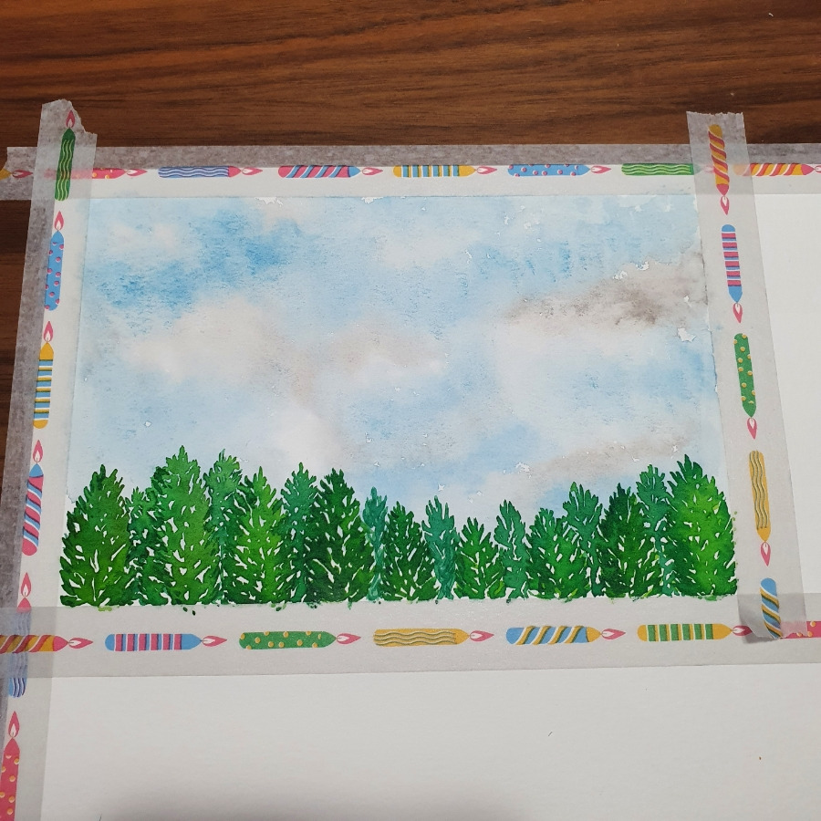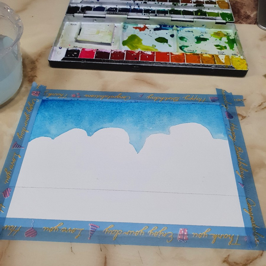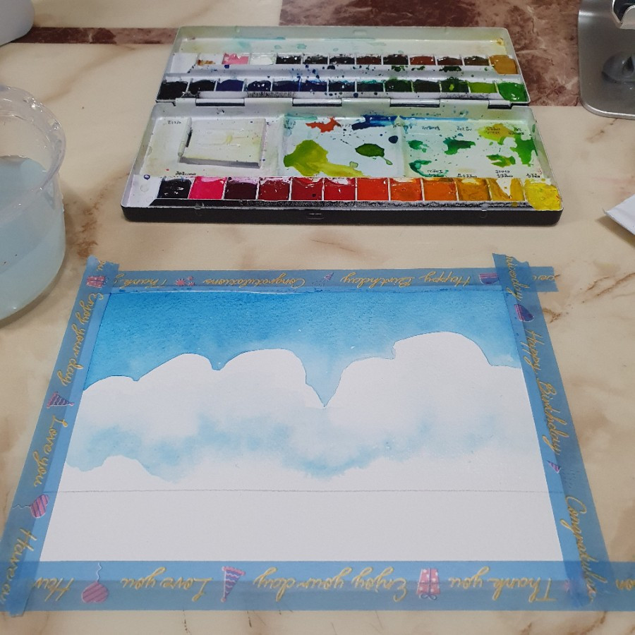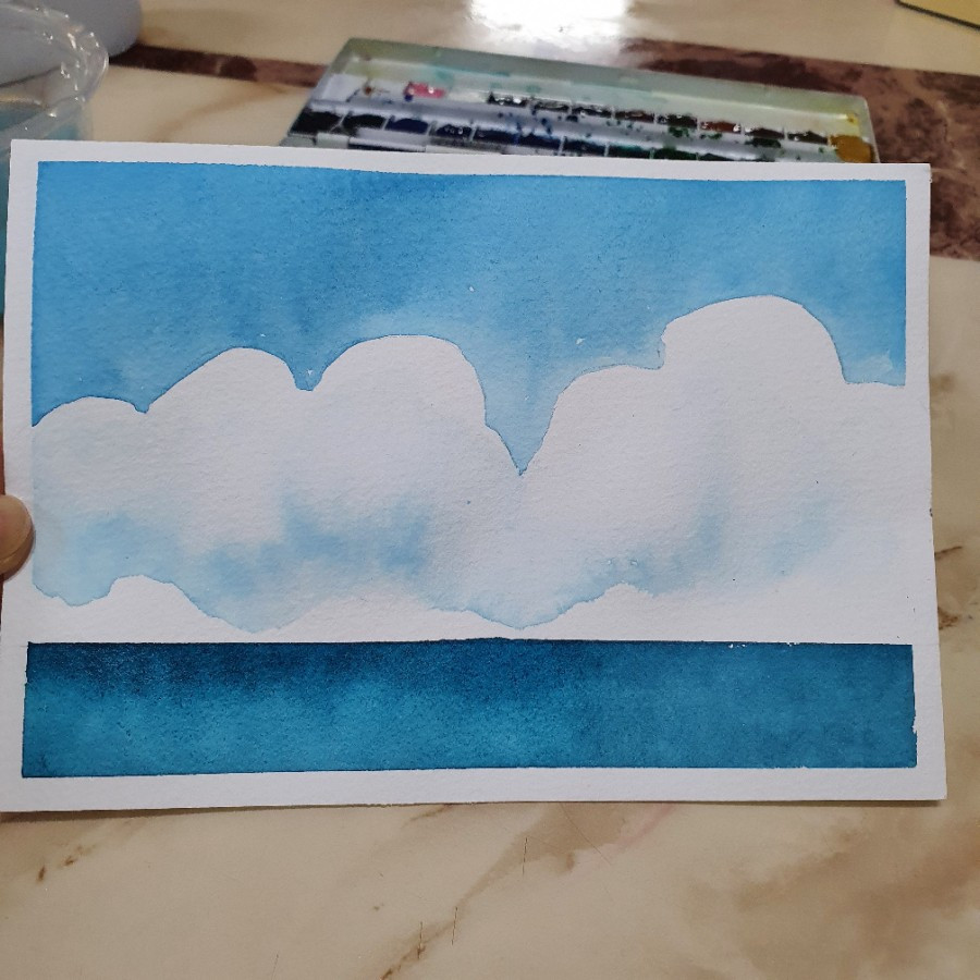 수채화, 오일파스텔, 붓펜으로 등을 이용하여 다양한 방법으로 색을 입히면서 그림을 살려보려고 노력했으나, 이미 실패했다는 마음으로 그려내니 구름도 소심하게 색이 올라가고, 하늘과 바다마저 생동감 없이 색이 들어가고, 특히나 바닥면은 처참해졌습니다.