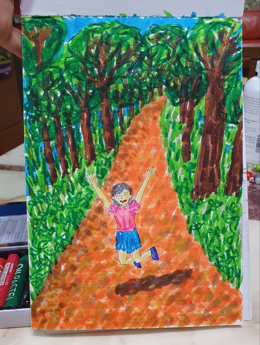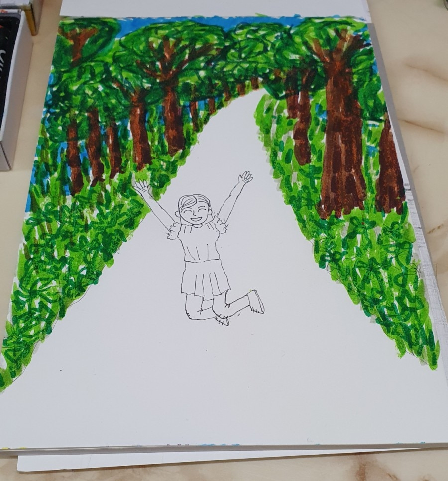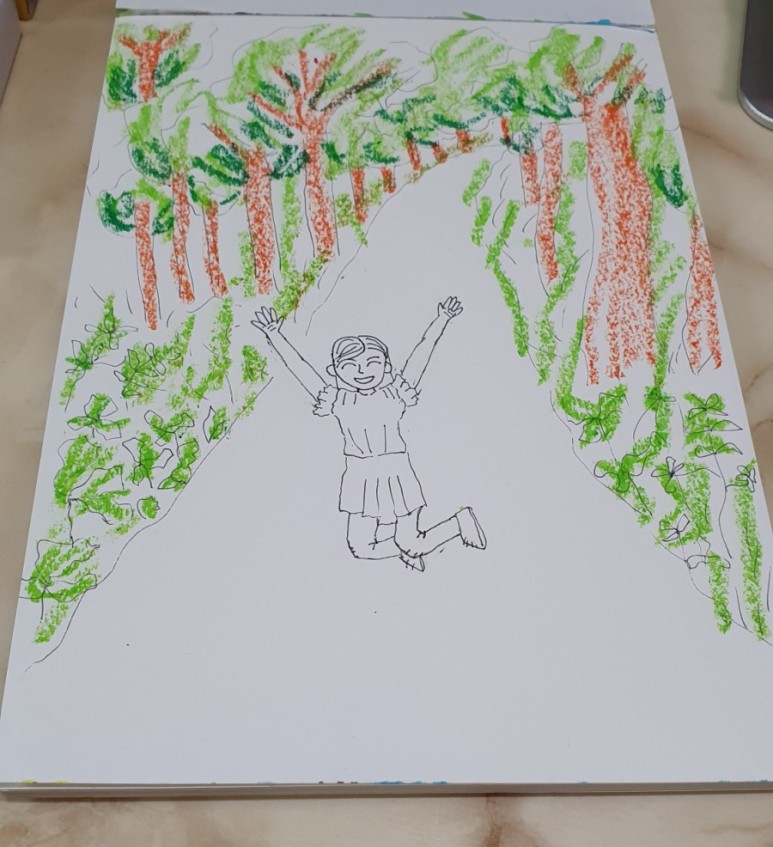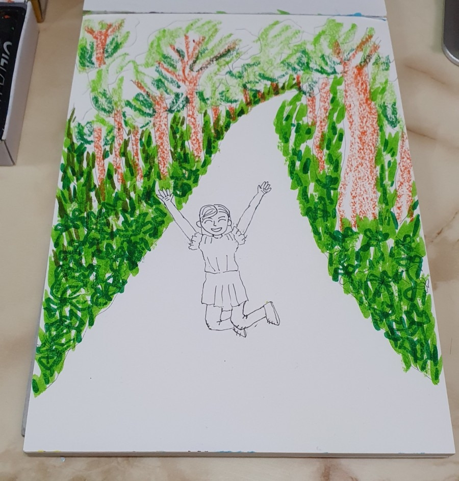 제주 치유의 숲에서 공중부양하는 아이들 5명을 모두 그림으로 담아내려고 했으나 한 명을 그리고는 기력 소진과 더불어 스트레스 풀 충전을 경험하고는 그 이후로 아이들의 앞모습을 그리려고 더 이상 노력하지 않았어요.