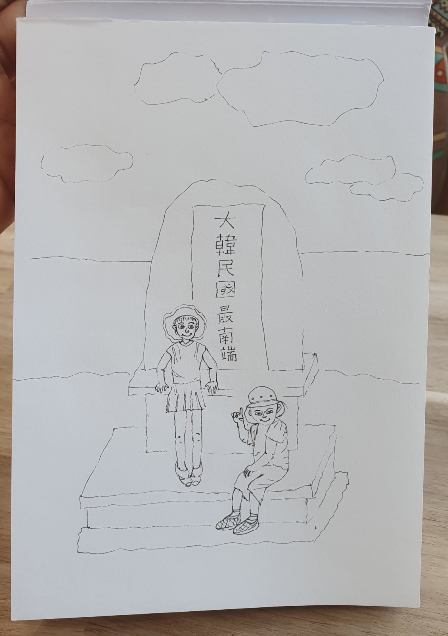 장난기 가득한 아이들 표정과 함께 마라도에 펼쳐진 푸르른 바다와 높고 짙푸른 하늘을 담아보겠다는 계획으로 스케치를 시작하였으나...
