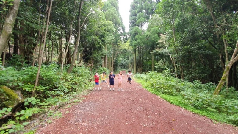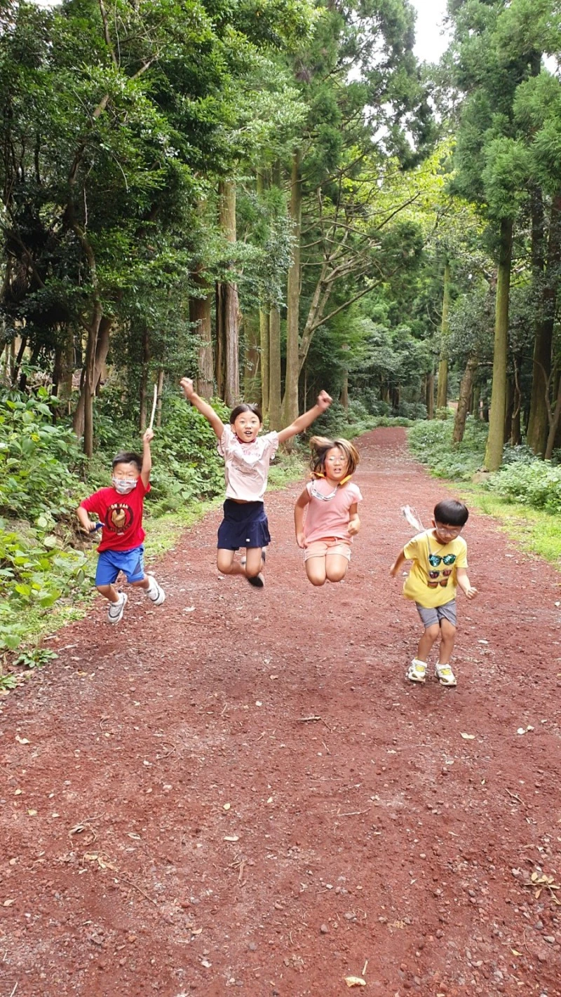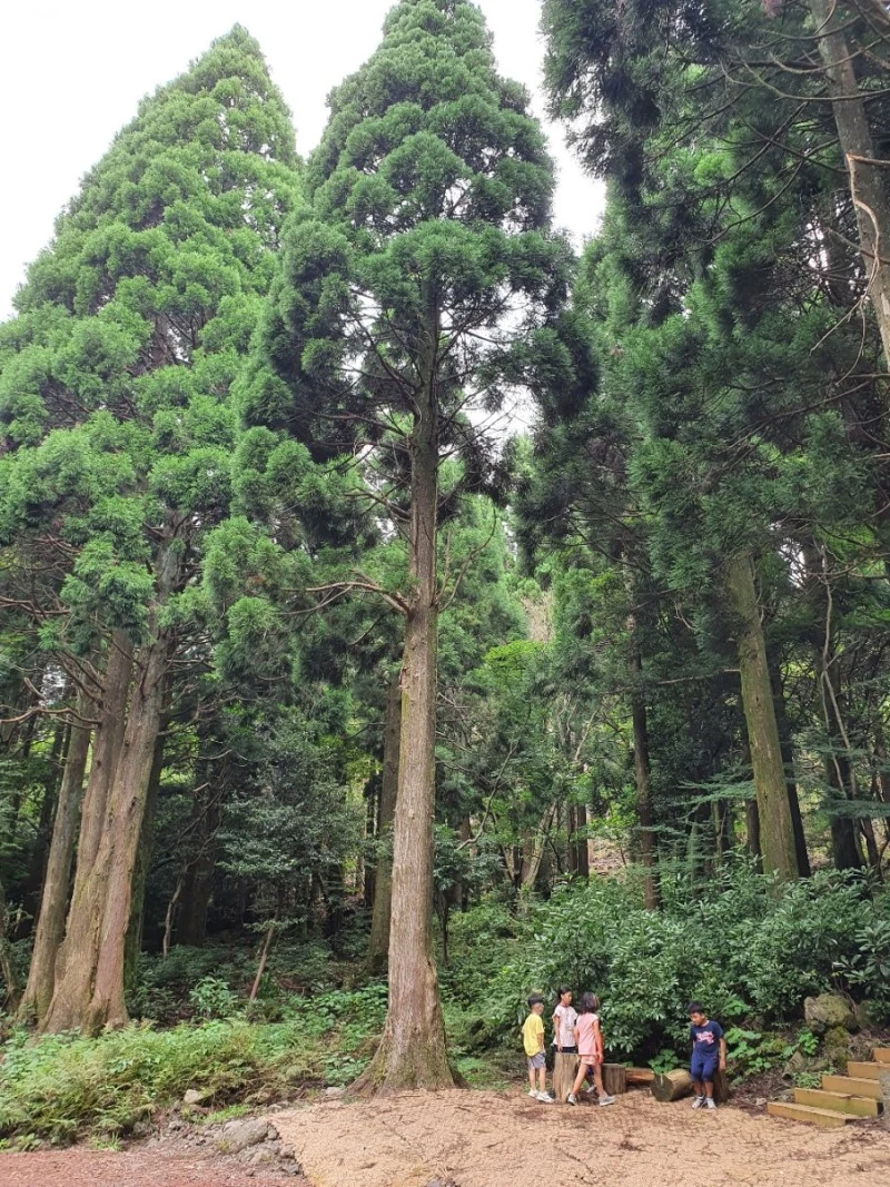 제주 치유의 숲에서 하늘에 닿을 만큼 키가 큰 나무들 사이에서 작은 아이들과의 산책.