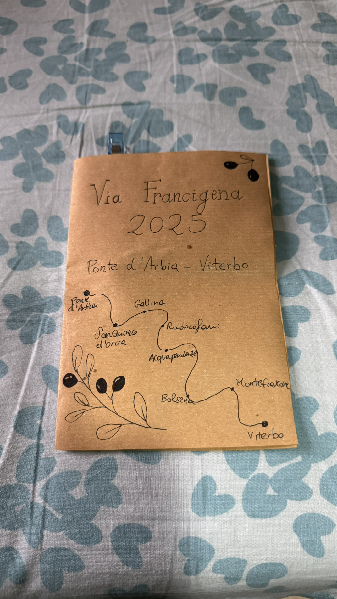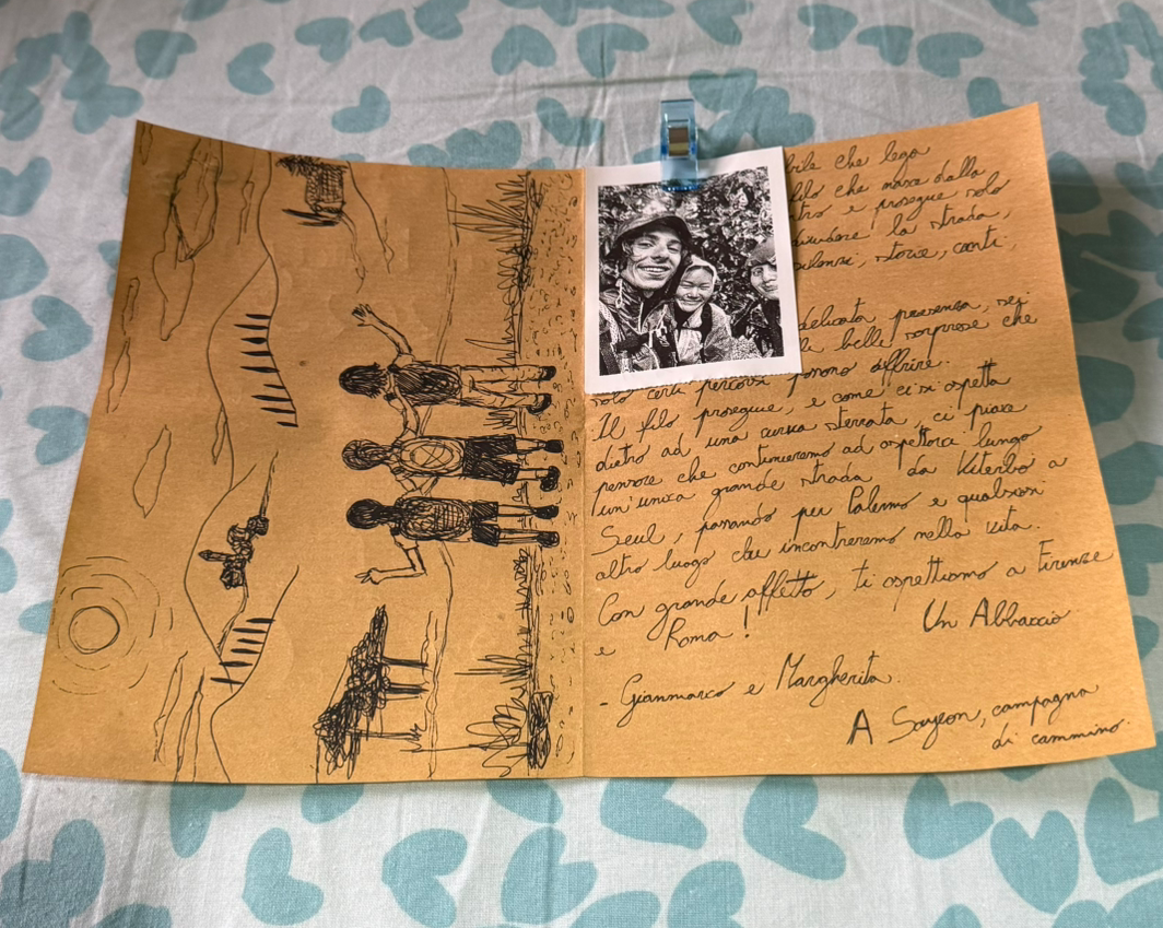 오늘의 숙소도 공동 저녁이 있는 숙소였지만 공동저녁은 스킵하고 오늘이 마지막 저녁이니 친구들이 차 타고 다시 비테르보로 온다고 해서 친구들을 기다린다. 친구들을 만나 프로세코를 마신다. 그리고 선물로 받은 편지. 내가 필기체를 잘 못 읽어 잔마르코가 직접 읽어주었다. 거의 자정이 다 되었나 숙소로 돌아가니 모두들 잠에 들어있다. 마지막일 줄 알았으나 내일 내가 걷는 길에 나오는 동네가 잔마르코네 집이 있는 동네라 친구들과는 내일 점심때 또 만나기로 했다. 내일을 위해 잠에 들어본다.
