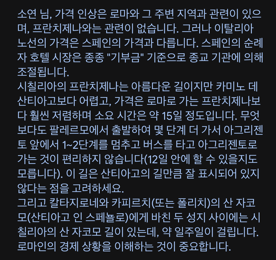 모든 일정을 미리 플랜하고 예약하는 것을 추천한다고 한다. 큰일 났다. 장장 3주간의 숙소를 하루하루 다 미리 예약하고 가야 한다니. 지금까지 걸어 본 까미노 데 산티아고 프랑스길과 포르투갈길에서 그렇게 한 번도 해본 적 없는데.. 중간에 그날따라 컨디션이 안 좋아 더 못 걷겠거나 더 많이 걷고 싶으면 어떻게 해야 하는 거지? 자유롭지가 않잖아.. 과연 이게 내가 원하던 걸까?라는 생각이 들며 스트레스가 밀려왔다.
