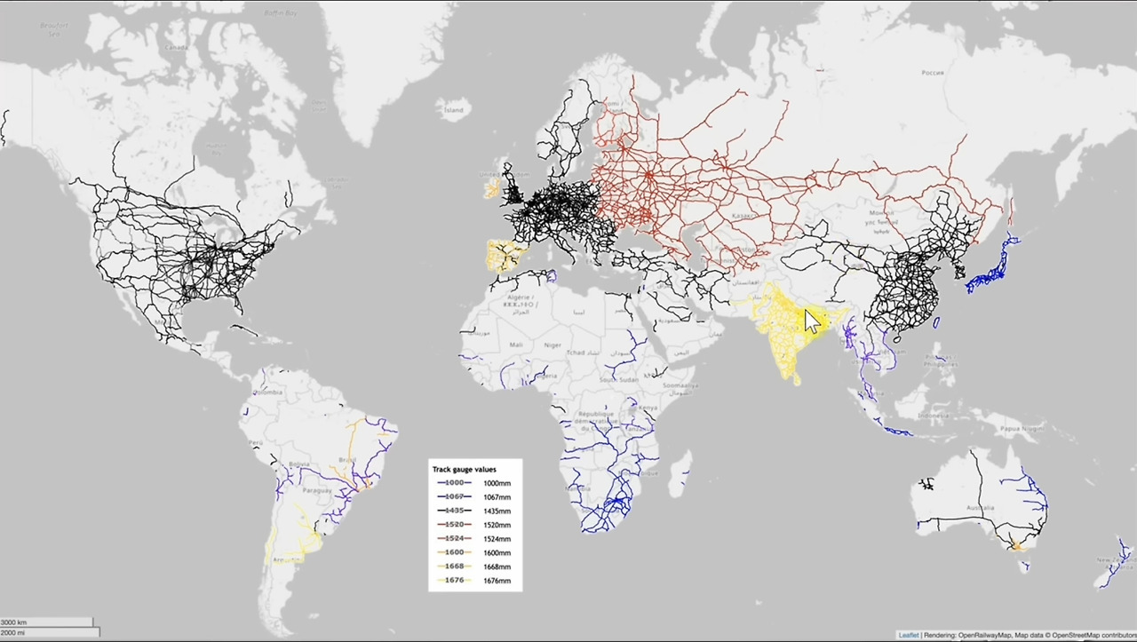 세계 궤간 지도를 펼쳐보자. 유럽과 중국을 잇는 검은 선은 1435mm의 표준궤를, 러시아의 붉은 띠는 1520mm의 제국 궤간을, 인도 대륙의 노란 구간은 1676mm의 광궤를 표시한다. 동남아와 아프리카 곳곳엔 파란 협궤가 흩뿌려져 있다. 이 색깔들은 지리적 정보가 아니라 문명의 층위를 드러낸다. 궤간이 갈라진 곳에서는 언어도 질서도 어긋나 있다. 궤간이 맞닿은 공간에서는 비단 물류만이 아니라 사유와 통제도 서로 교차한다.