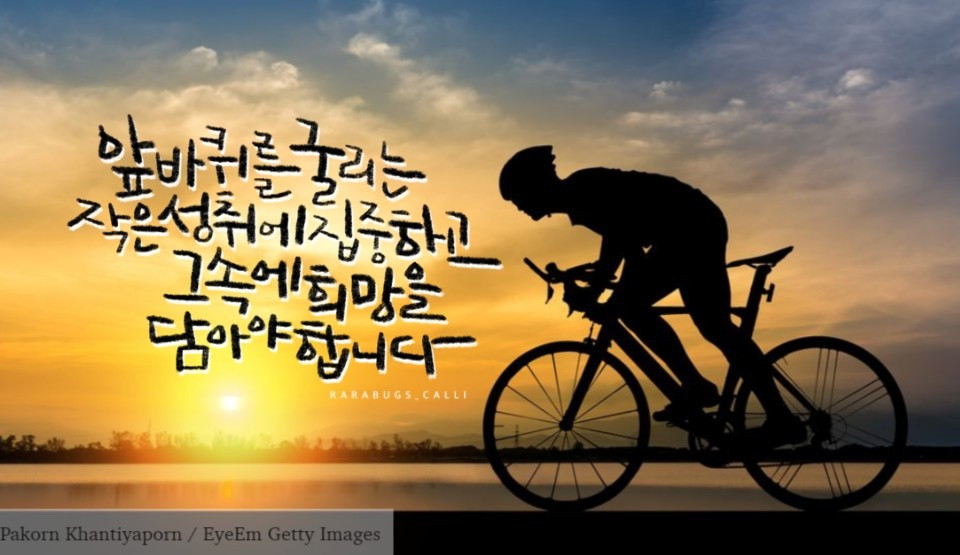 김민식 PD는 살다가 힘들 때가 오면 대학시절 자전거를 타고 한계령을 넘었던 생각을 한다고 합니다. 한계령을 자전거를 타고 오르다 보면 굽이굽이 고갯길이 이어집니다. 하나의 고갯길을 다 돌았다 싶으면 또 다른 고갯길이 나와 사람을 잡습니다. 그 고비의 순간에 고개를 들어 산 정상을 바라보면 안 된다고 합니다. 산 정상을 보면서 “이 고개만 넘으면 정상이겠지”라는 생각, 이 속절없는 희망에 속고 또 속다 보면 기운이 빠져 그 자리에서 포기하게 된다고 합니다. 이럴 땐 그저 코앞에 있는 아스팔트에 눈을 고정하고 기어를 최대한 낮춰 한발 한발씩 꾸준히 페달을 밟습니다. 그러면 조금씩 나가고 있는 앞바퀴를 볼 수 있습니다. 이 앞바퀴를 굴리는 작은 성취에 집중하고 그 속에 희망을 담아야 합니다.