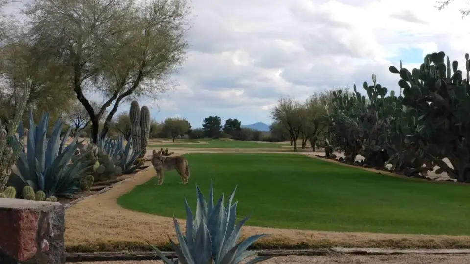 오후쯤에 나타난 골프장의 코요테. 우리 주변을 일정 거리를 두고 따라다녀서 골프채로 위협을 가했는데도 슬쩍슬쩍 피하는 흉내만 냈다. 그 배후엔 몇 마리 무리가 있었다. 밴쿠버 코요테는 단독생활을 하는데 여긴 댓 마리씩 군집생활을 하는 게 독특했다.
