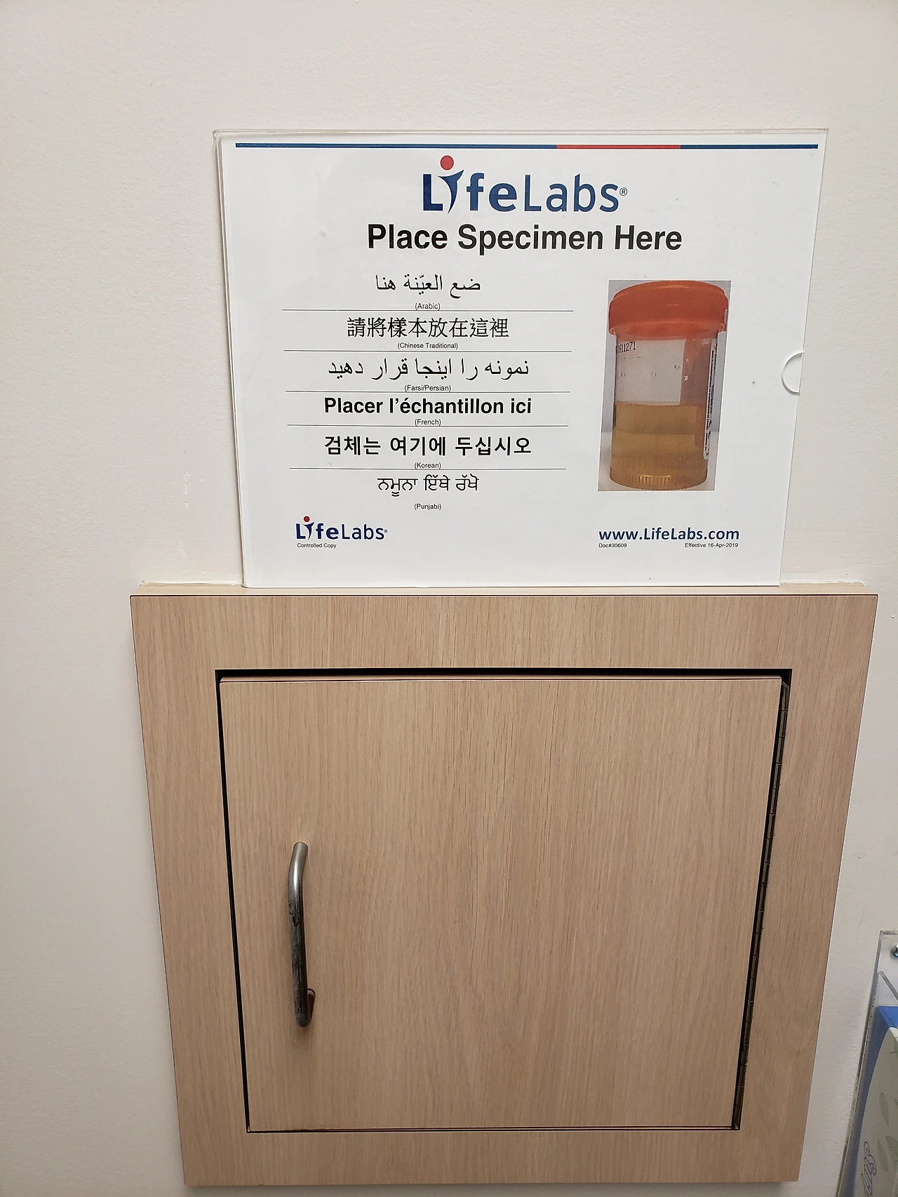 랩화장실에걸려있는 한글 안내문. 한인 이민자들이 캐나다사회에 뿌리를 내린걸까. 아래 고리를 잡아당기면 작은 선반이 나오고 그곳에 검사샘플은 놓아두면된다.