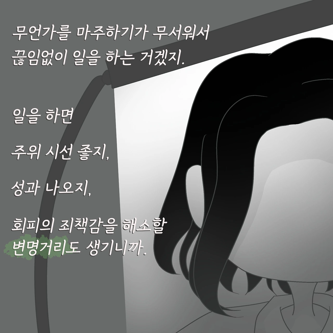 저 같은 경우에는 어떤 문제에 대한 강박감과 불안감으로부터 회피하기 위해 워커홀릭처럼 일을 했습니다. 그냥 놀기에는 제가 가진 문제들이 저를 극심하게 괴롭혔으니까요. 저는 시간에 대한 강박감도 있었고, 감정을 회피하는 성향도 있었습니다. 그 모든 것들을 마주하기가 무서워서 도망친 곳은 늘 일이었죠.