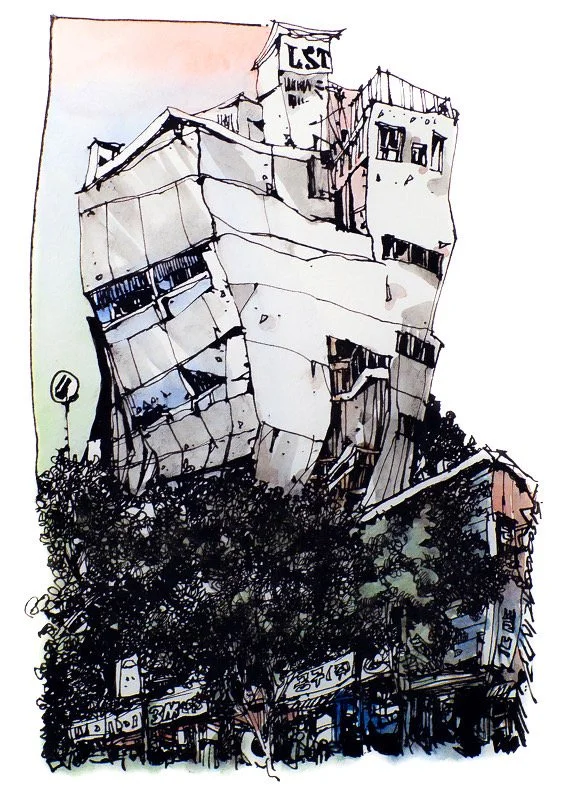 을지로 공구상가.쭈그러진 건물은 아니지만 낡은 건물이긴 하다.앞 청계천의 나무들이 혼자 신나게 푸르다.이팝나무는 바람 불고 비가온 뒤로 밥알을 날린다.