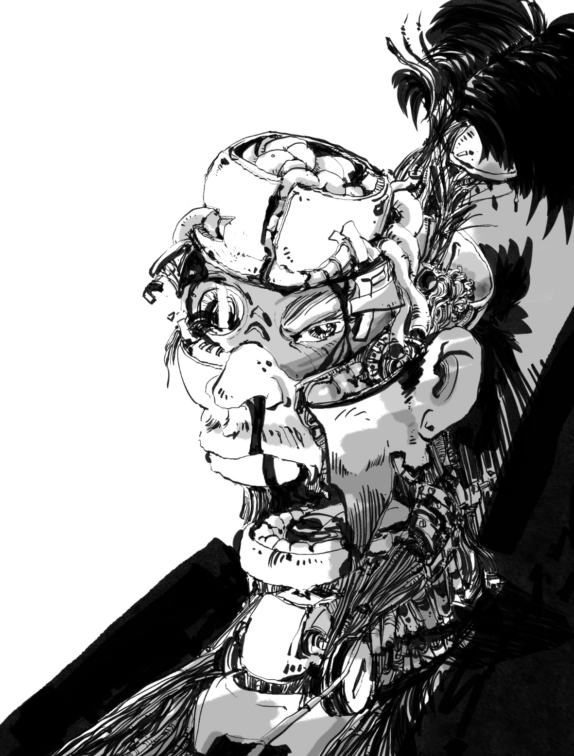 기계인간은 망가진 장비 수리 중이다.