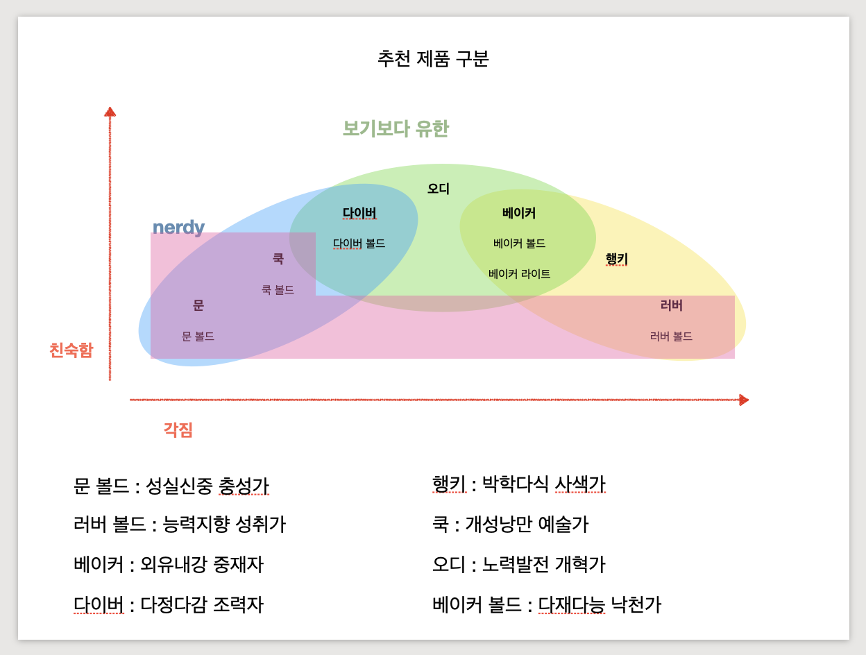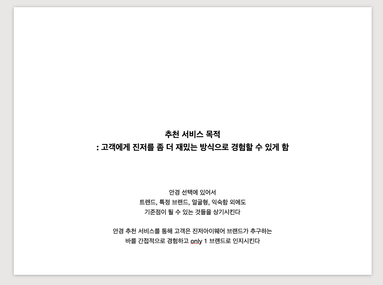 쇼룸을 방문했던 오랜 고객님에게 안경 추천 서비스를 준비 중이다고 말씀을 슬쩍 드려봤습니다. 그러자 그분께서 얼굴형으로 추천해주시는 거죠란 말에 어 이거 뭔가 잘못된 건가 싶었습니다.