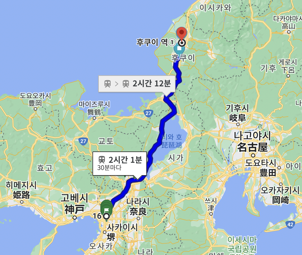 공장이 있는 후쿠이에는 국제공항이 없습니다. 지도를 보니 오사카나 나고야가 가깝네요. 오사카에서 공장까지는 기차로 약 2시간 거리입니다.