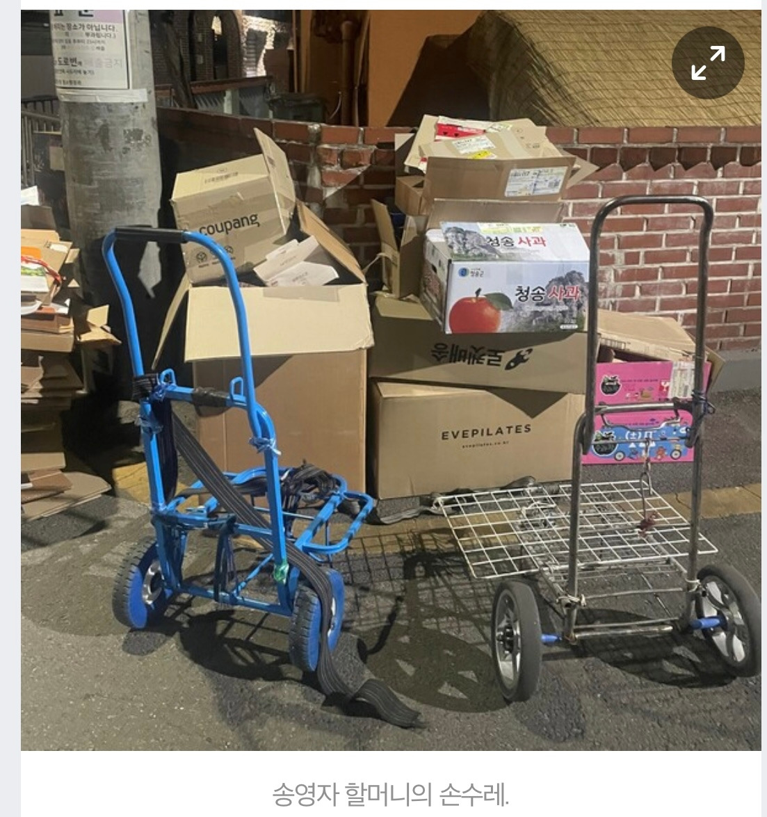 "폐지 놓을 장소 이렇게 놔두면 여기는 민원을 안 넣는데 다른 곳은 민원을 넣거든. 국가에서 박스 같은 거 모아 두면 민원 같은 거 안 넣게 해줬으면 좋겠어. 다른 건 바라지도 않아. 이것만이라도 해줬으면 좋겠어."