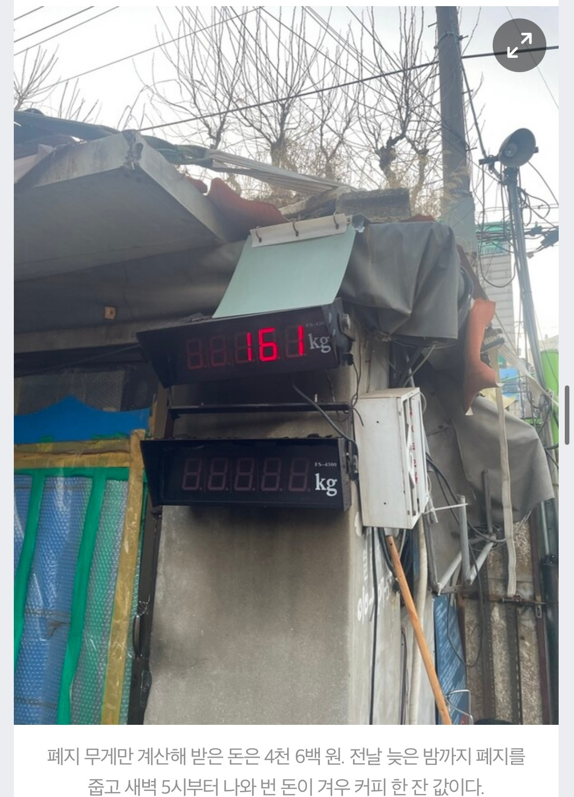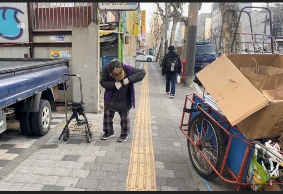 아침 6시 서대문구의 한 고물상 앞에 폐지 수집 노인이 쪼그리고 앉아 있습니다. 고물상 문이 열리기를 기다리는 중입니다. (고물상은 아침 7시에 문을 열니다.) 할머니 주변에서 잠시 서성거리다 다가가 물었습니다.