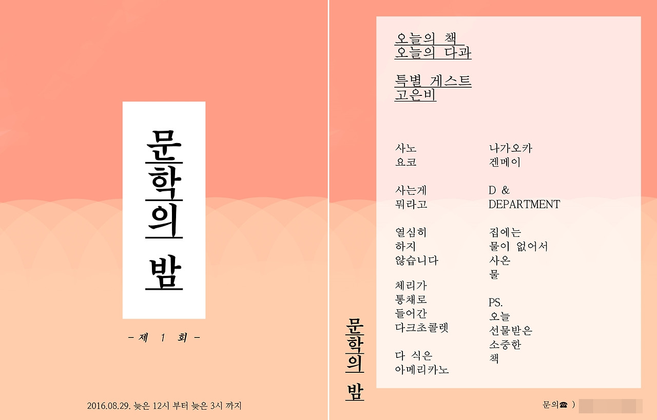 위 사진이 내가 만든 <문학의 밤> 포스터다. 원래는 혼자 할 계획이었는데, 은비 언니가 함께 하게 되었다. (이 사람 중간에 잤다!) 어쨌든 책과 다과를 준비하여 시작하게 되었다.