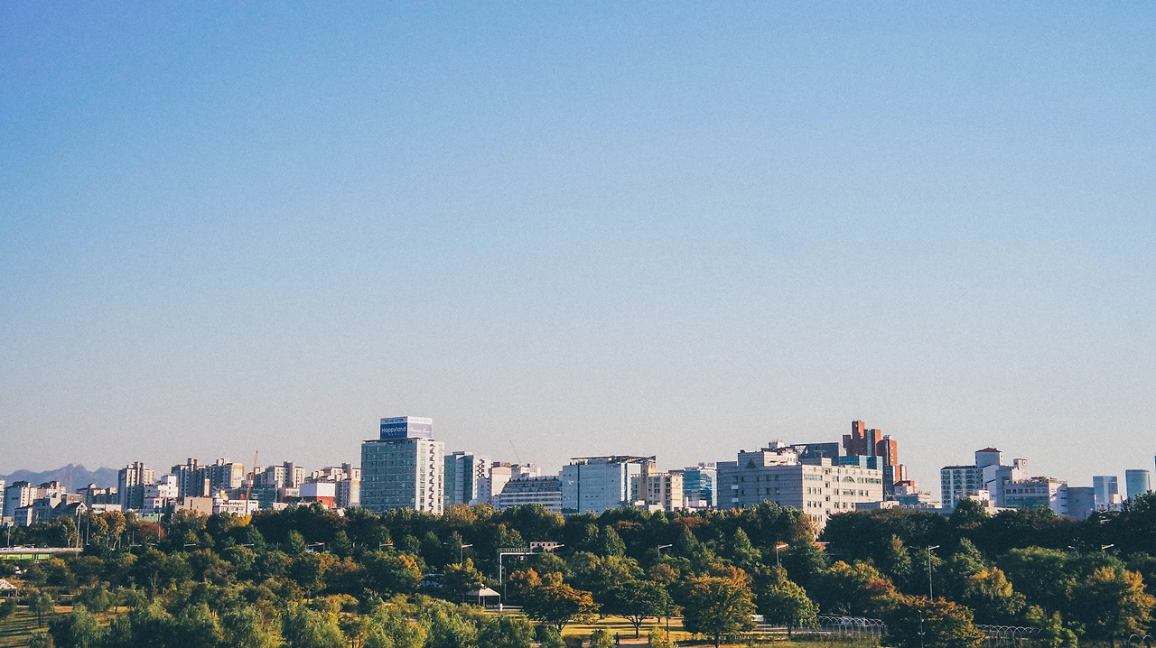하늘이 높고 청명한 날엔, 어떤 풍경이라도 마음속에 담기는 법이다. 푸른 나무들 뒤로 회색빛의 건물들이 오묘한 느낌으로 다가온다.