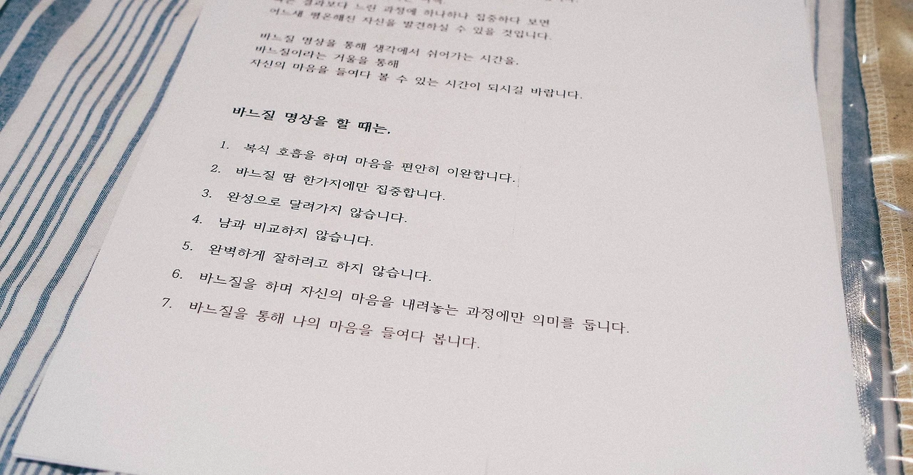 아침 먹는 것부터가 어긋나니 하나하나 다 짜증이 나기 시작했는데, 다행히도 오늘은 마음을 치유하는 바느질 명상을 하는 날이었다.