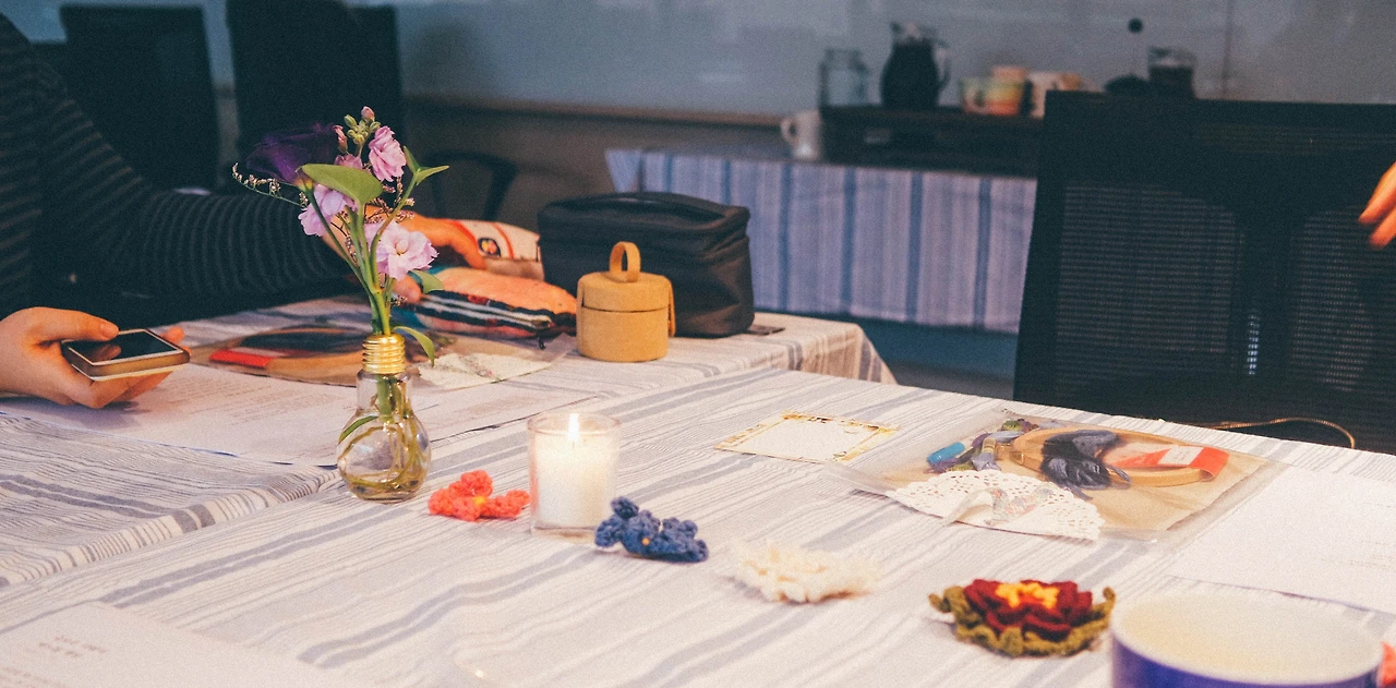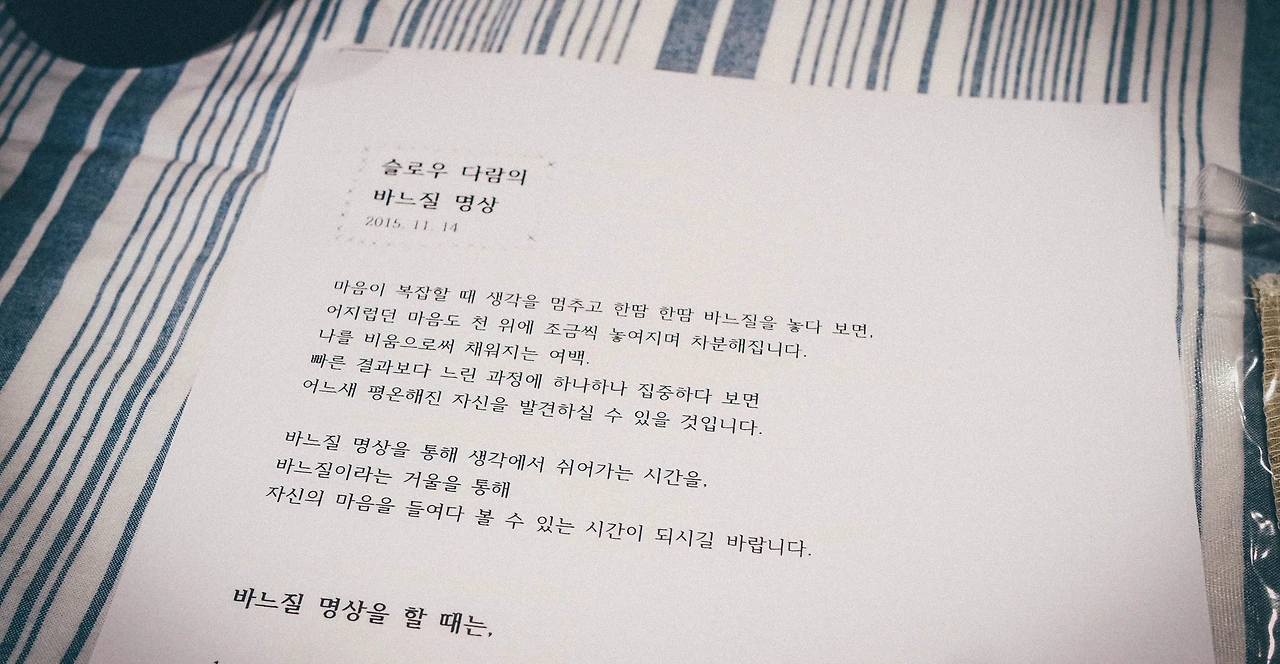 도착해서 잠시 대기하다가 들어선 바느질 명상 교실은, 세팅까지 완벽했다. 은은한 분위기는 나를 설레게 해서, 오늘 할 바느질을 자꾸만 기대하게 만들었다.