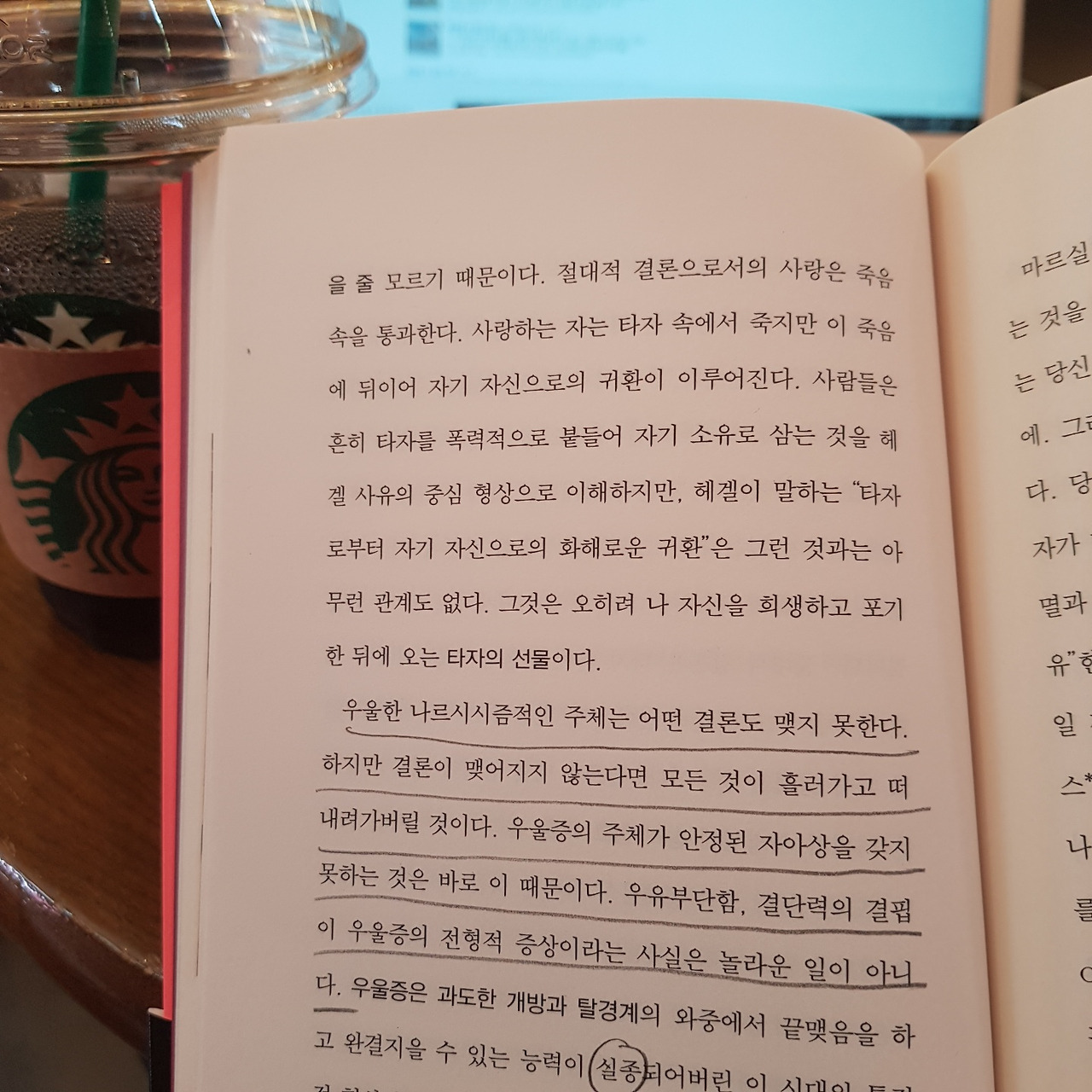우울증은 나르시시즘적 질병이다. 우울증을 낳는 것은 병적으로 과장된 과도한 자기 관계이다. 나르시시즘적 우울증의 주체는 자기 자신에 의해 소진되고 기력이 꺽여버린 상태이다. 그는 세계를 상실하고 타자에게 버림받은 자이다. 에로스와 우울증은 대립적 관계에 있다. 에로스는 주체를 그 자신에게 잡아채어 타자를 향해 내던진다. 반면 우울증은 주체를 자기 속으로 추락하게 만든다. 오늘날 나르시시즘적 성과주체는 무엇보다도 성공을 겨냥한다. 그에게 성공은 타자를 통한 자기 확인을 가져다준다. 이때 타자는 타자성을 빼앗긴 채 주체의 에고(ego)를 확인해주는 거울로 전락한다. 이러한 인정의 논리는 나르시시즘적 성과주체를 자신의 에고 속에 더 깊이 파묻혀 헤어나오지 못하게 만든다. (20p.)