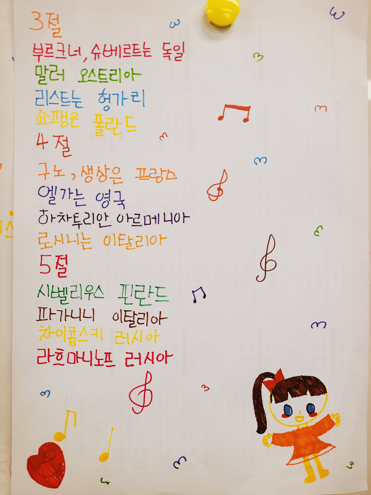 쉽게 기억하라고 노랫말을 만들었다. '베토벤 브람스는 독일~'로 시작하는 노래를 다 함께 불렀다. 틈틈이 만든 노래가 무려 5절까지있다. 빛나는 곡들을 만든 음악인이 이렇게나 많으니 앞으로 몇 년 넉넉히 수업을 해도 되겠다. 목청이 좋아 수업에 힘이 되는 규ㅈ이가 태권도를 갔다. 아쉽지만 혜ㅅ이를 선두로 함께 5절까지 불렀다. 발음이 긴 작곡가는 아무래도 어렵다. 라흐마니노프, 하차투리안, 차이콥스키는 스타카토를 넣어 부르게 했다.