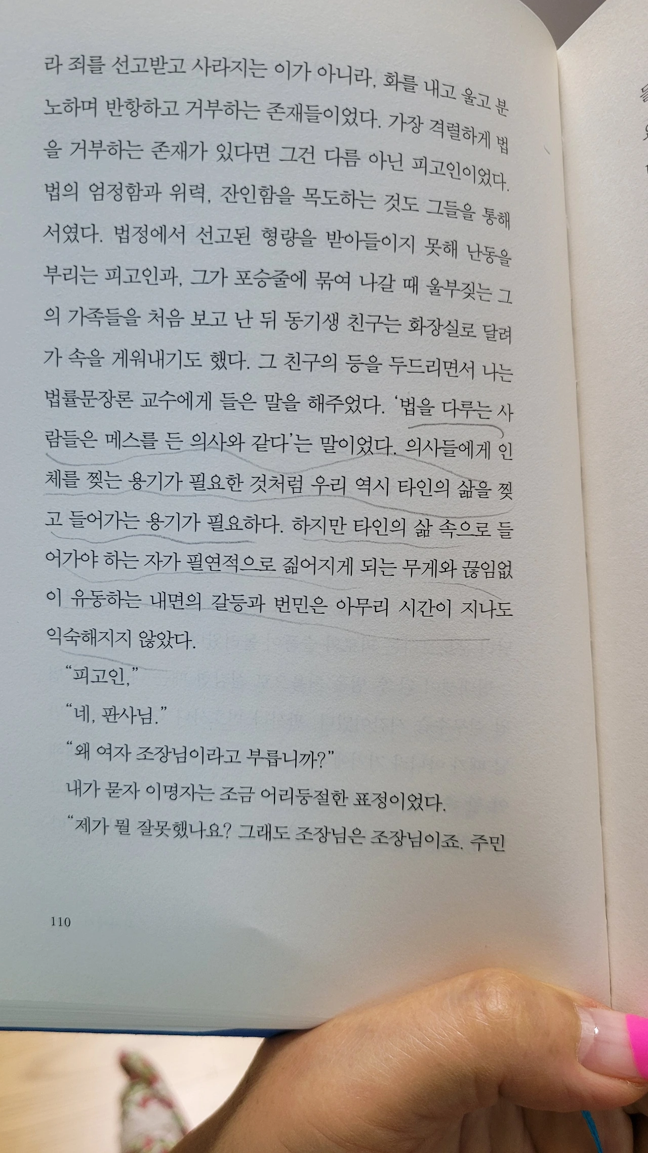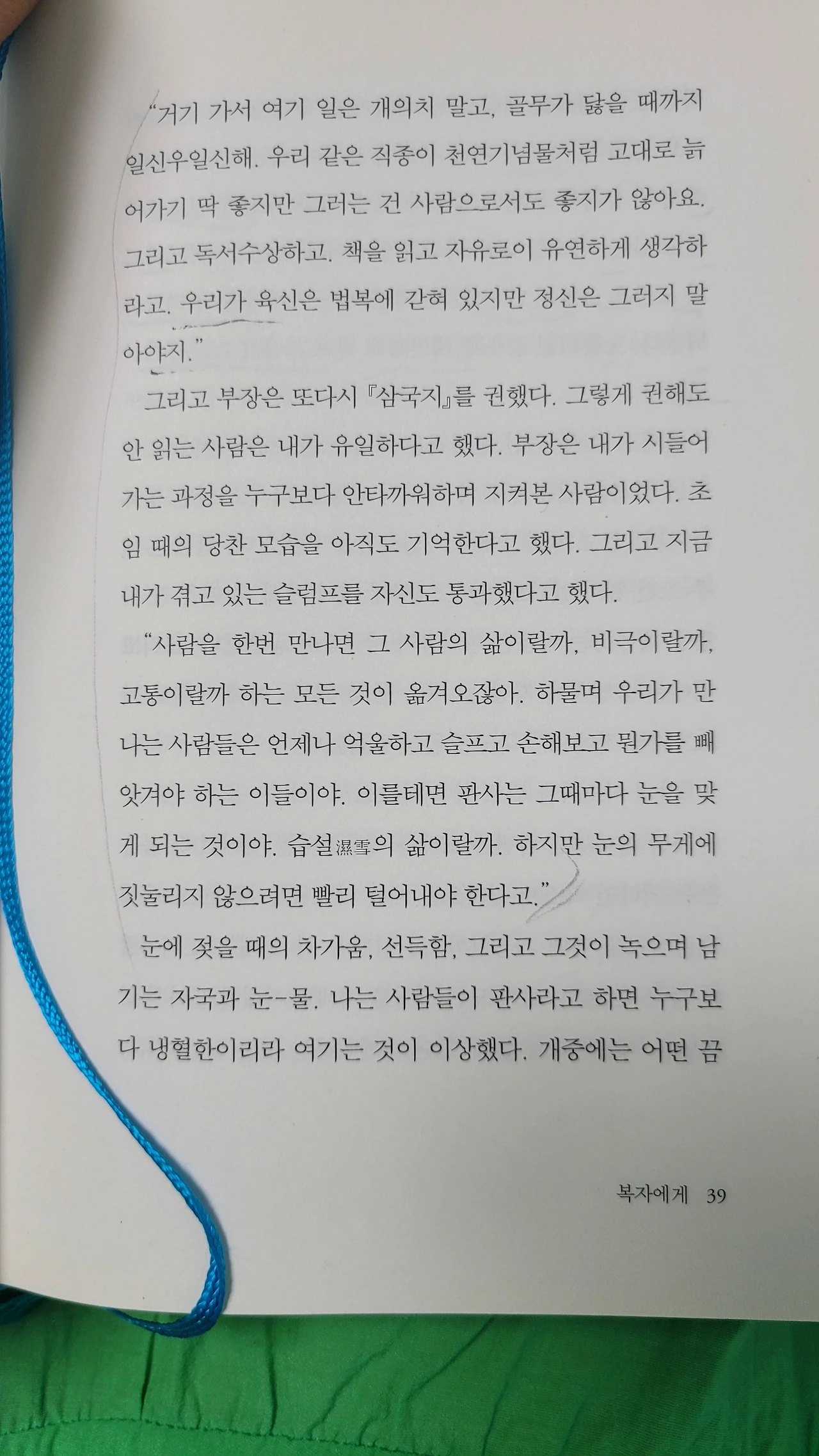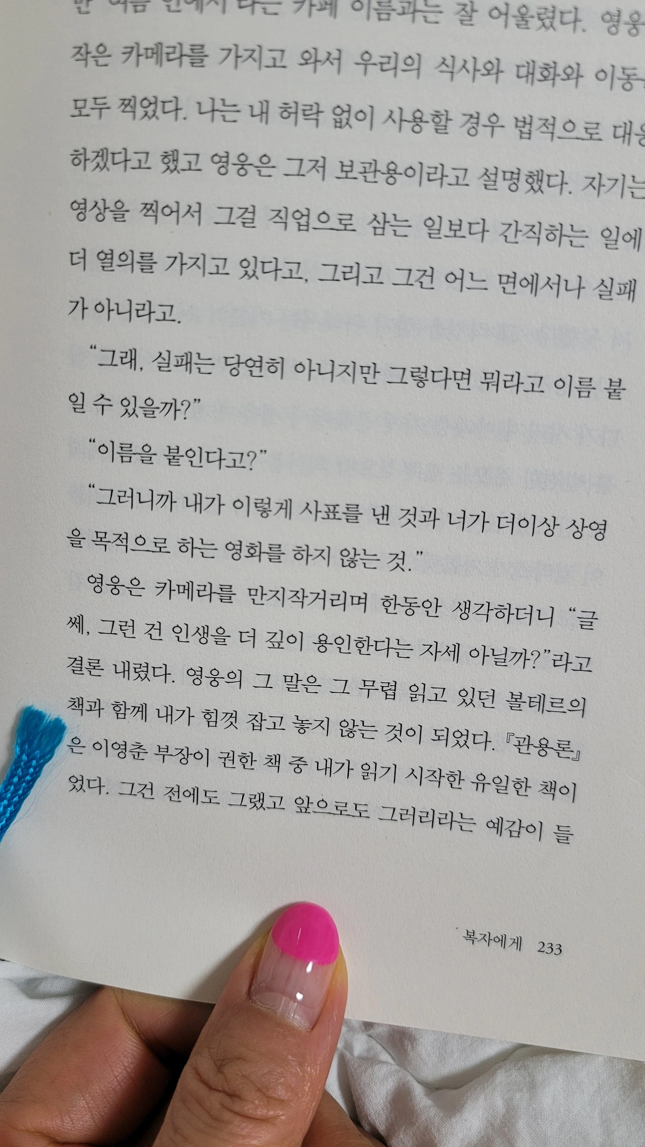 소설을 완성한 작가가 고른 소설의 한 문장은 '나는 실패를 미워했어'였다. 소설을 다 읽은 독자가 고른 한 낱말은 '용인'이다. 법복을 벗은 이영초롱과 영상을 찍어서 직업으로 삼는 것보다 간직하는 일이 더 좋은 것을 실패가 아닌 '인생을 더 깊이 용인하는 자세'라는 영웅의 문장에 내 마음을 잇대어 오늘도 일어선다. 비스듬히.